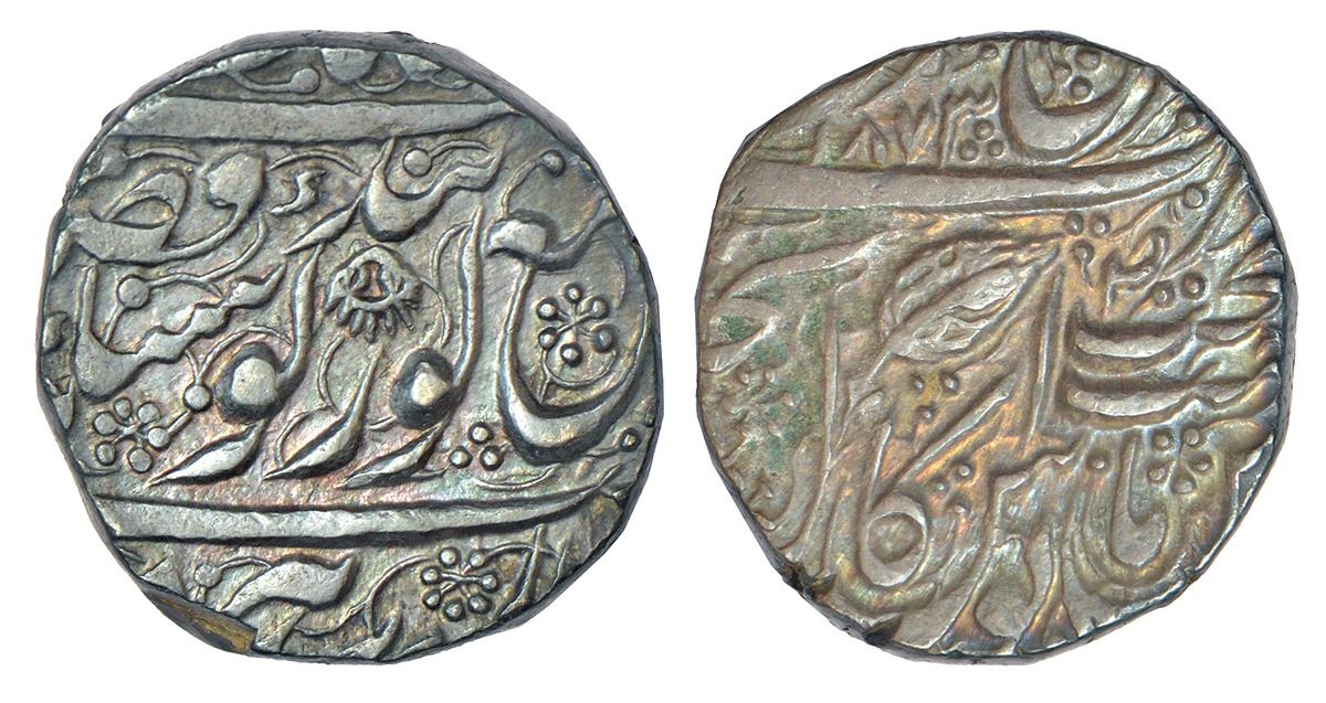 Independent Kingdoms: Sikh Empire - silver rupee of Ranjit Singh (1799-1839 AD), Amritsar mint, VS 1873, Herrli 01.07.04, 11.10g. Obv: 'Nanakshahi' couplet, version V; chakkar (Sikh weapon) symbol between 'Guru' and 'Gobind'; rosette below 'Singh'. Rev: 'Julus' formula with Ber leaf symbol, small letter 'Suad' to right. (From the collection of Mr. I.K. Kejriwal)
