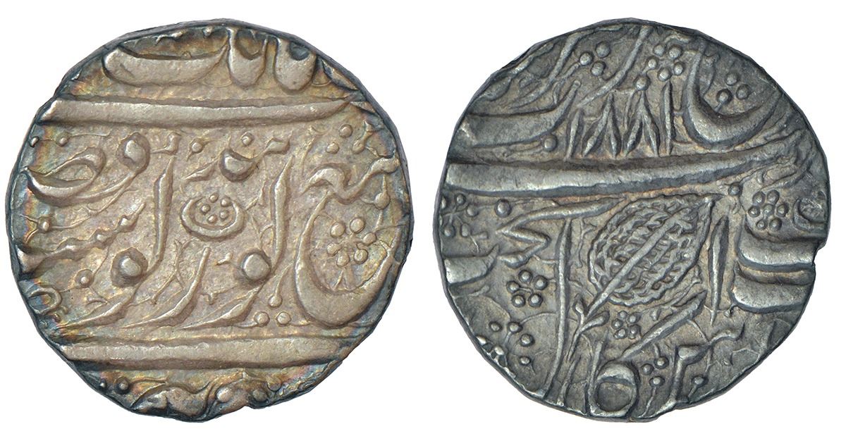 Independent Kingdoms: Sikh Empire - silver rupee of Ranjit Singh (1799-1839 AD), Amritsar mint, VS 1881, Herrli 01.07.04, 11.09g. Obv: 'Nanakshahi' couplet, version V; crescent with cluster of dots between 'Guru' and 'Gobind'; comb (kanghi) symbol below 'Singh'. Rev: 'Julus' formula with Ber leaf symbol. (From the collection of Mr. I.K. Kejriwal)