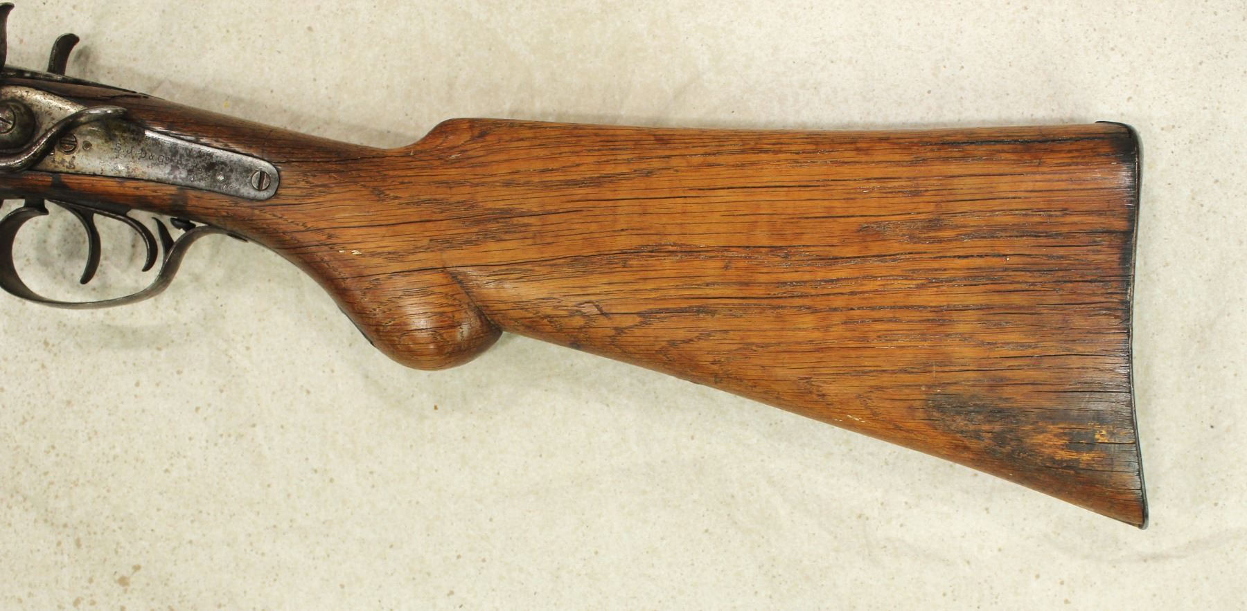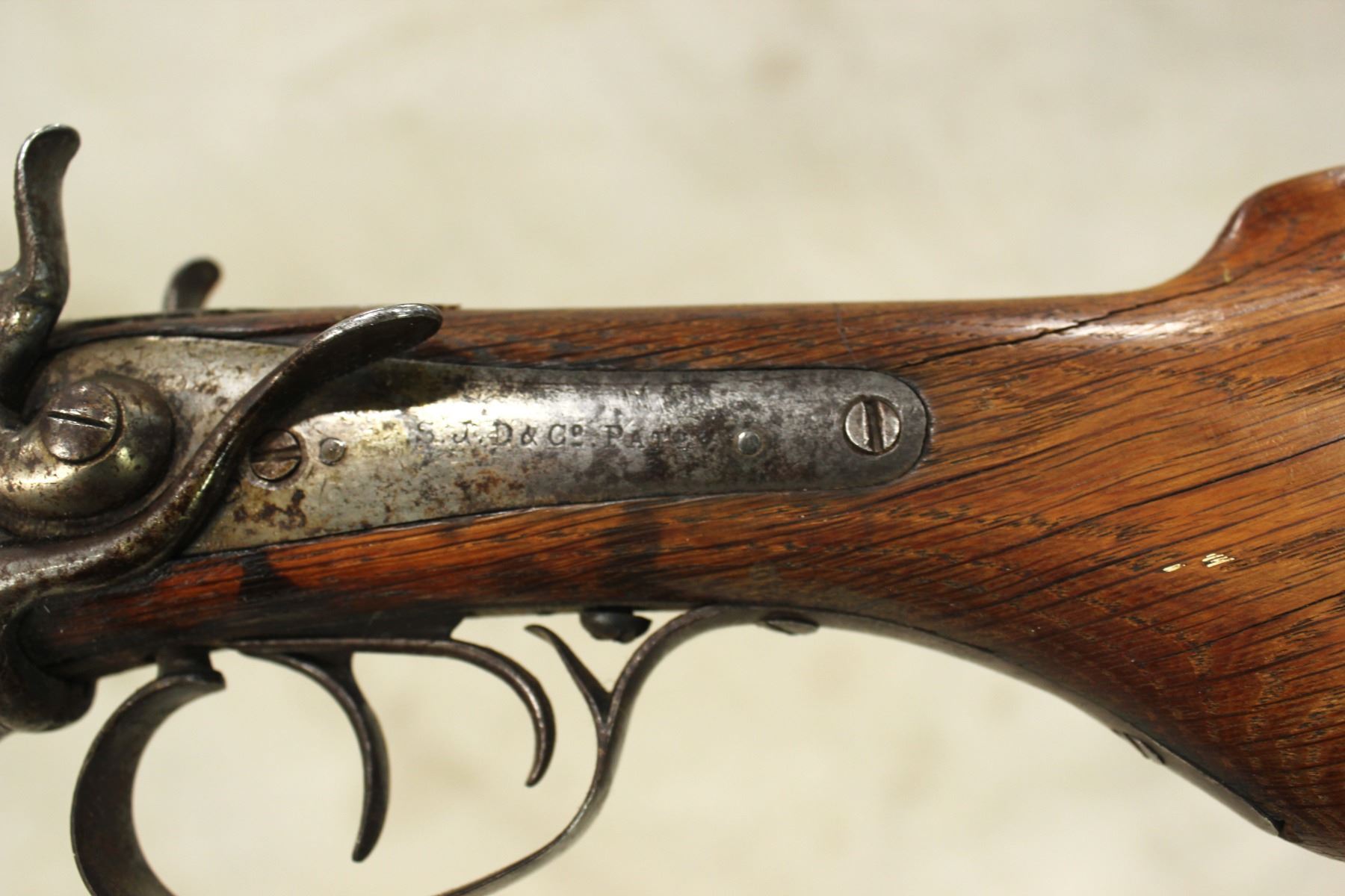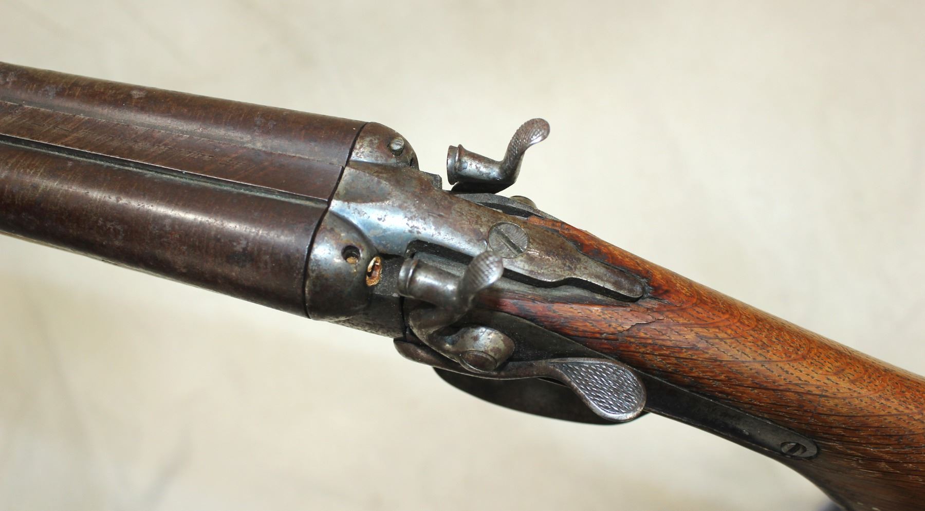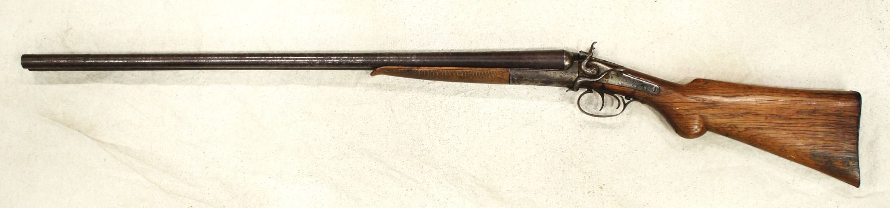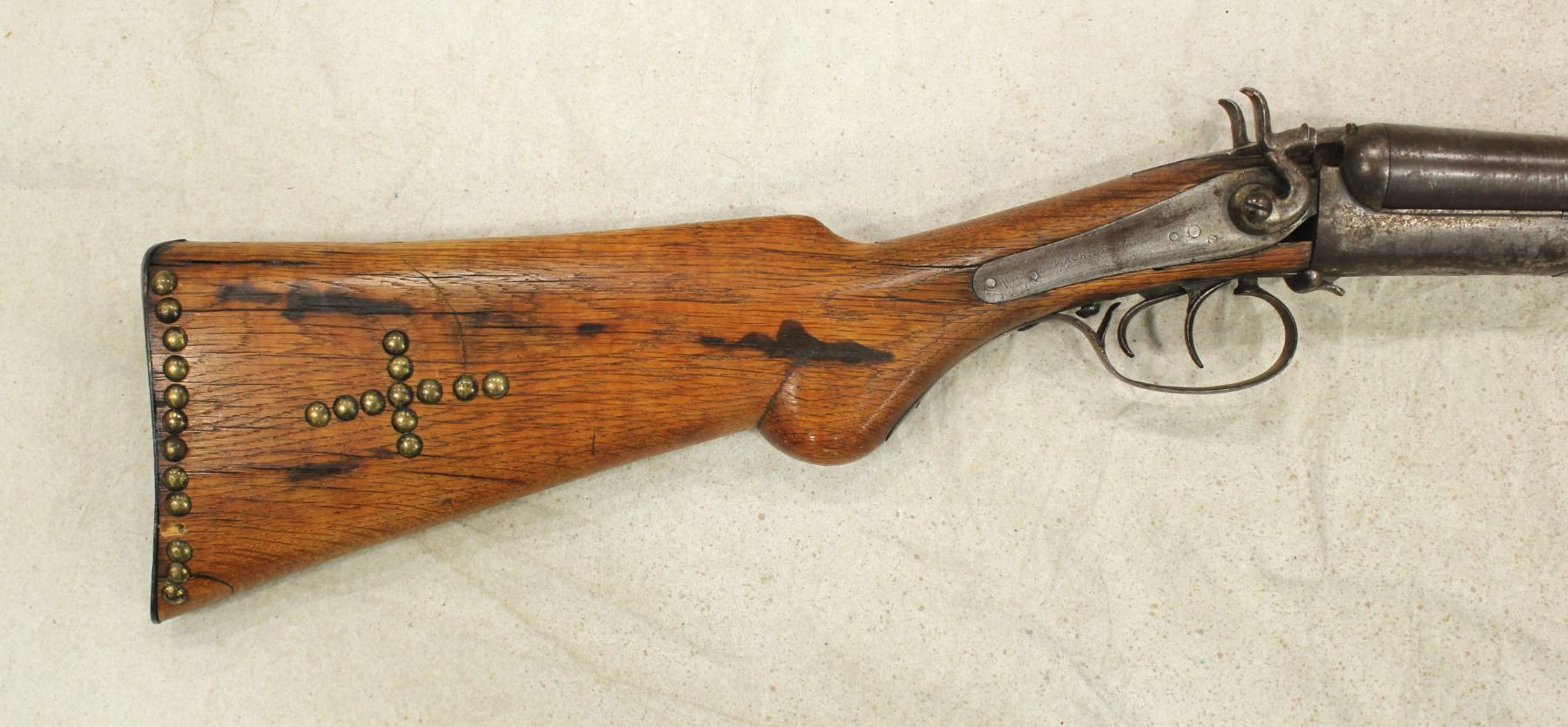 A percussion double barrel, side by side shotgun, in 12 gauge, marked J.D. & Co. on the lock, displaying a checkered oak stock with brass tack design, and 30” barrels showing mottled patina color. Showing wear and use.