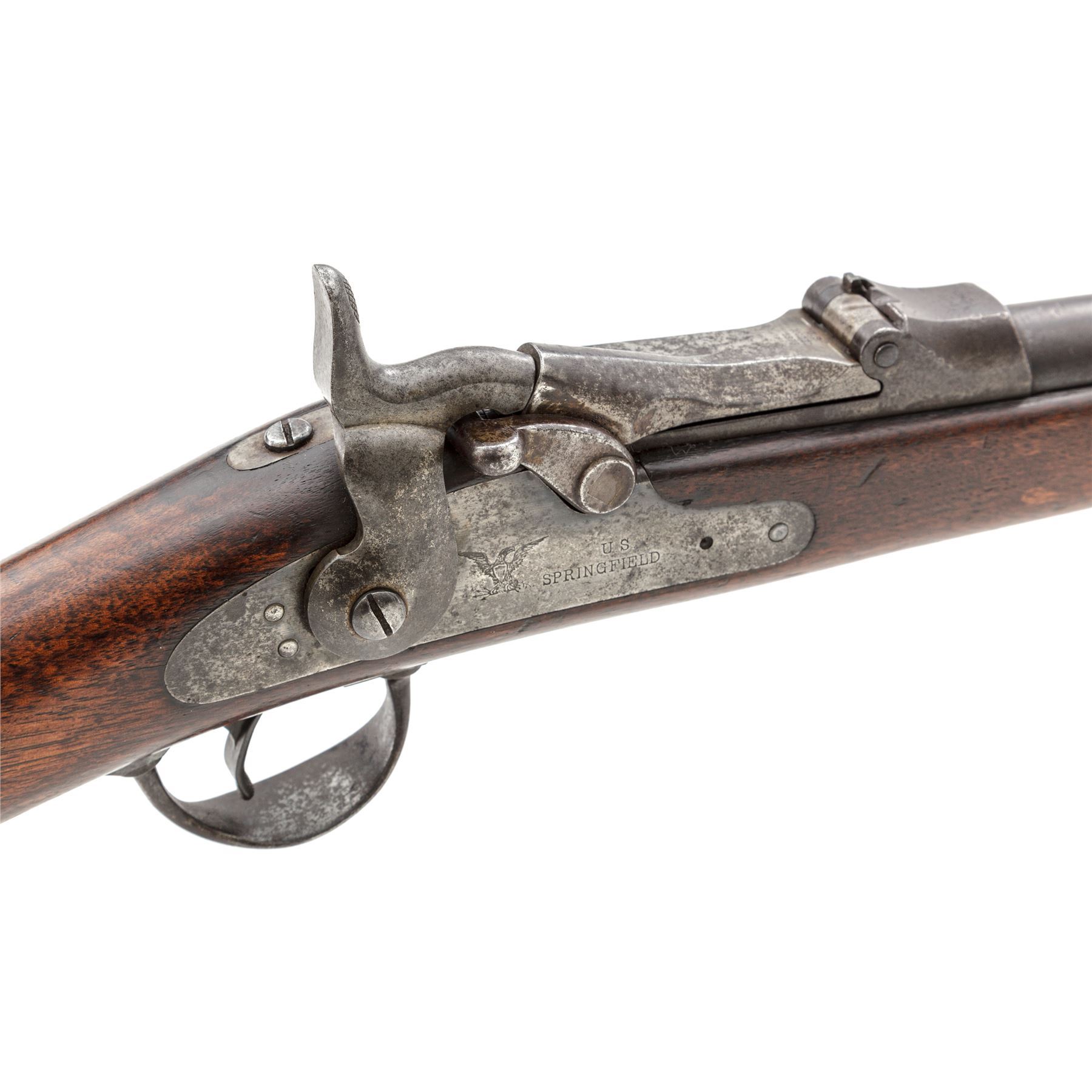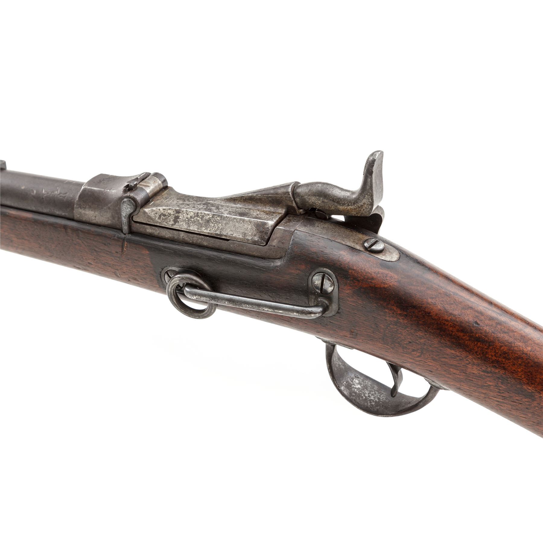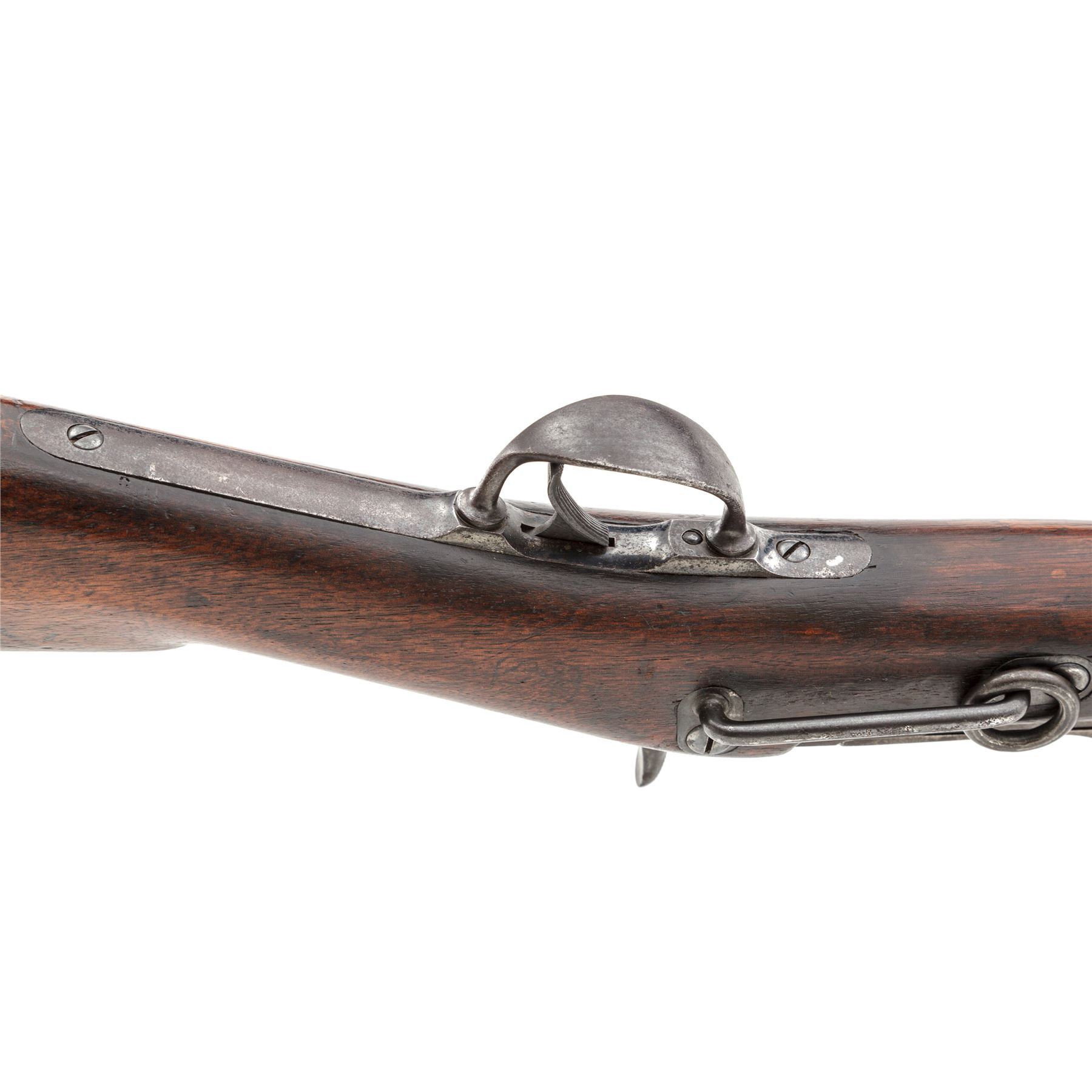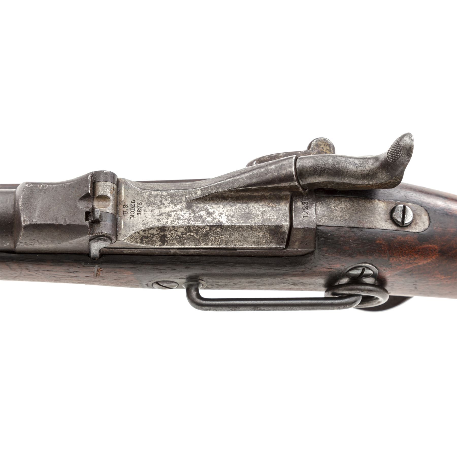 Indian Wars U.S. Springfield Model 1873/1877 Trapdoor Saddle Ring Cavalry Carbine, #122370, .45-70 Gov't. cal., 22'' barrel is marked ''V/P/(eagle head)'' at left breech, and fitted with a block-blade front sight and adjustable sliding-leaf rear sight (correctly marked ''C'' for Carbine); trapdoor is marked ''U.S./Model/1873'' below hinge; lockplate is marked ''(spread-wing eagle)'' to left of ''U.S./Springfield'' below breechblock latch; side opposite lock is fitted with a sling bar and ring; standard two-piece triggerguard, buttplate marked ''US'' on top tang with sliding door opening to cleaning rod trap in butt (three-piece rod is present), and single spring-retained barrel band; oil-finished walnut halfstock. Mfg'd ca. 1877-78. Condition is very good, the barrel with a later dark-bluish finish over scattered pitting, the balance of the steel parts a gunmetal gray color with silvered case hardening. Triggerguard and buttplate retain 40%-50% blue with scattered erosion. Stock is solid with the expected marks from age and military use. Action is stout; bore is clean with defined rifling. The ''P'' proofmark is present on stock belly, but the ''ESA'' cartouche of Master Armorer Erskine S. Allin is not visible at left wrist. The Model 1877 improvements included a thicker stock wrist and longer comb, cleaning rod butt trap with hinged door, ''low arch'' breechblock, and others. Est.: $2,500-$3,500. (Antique)