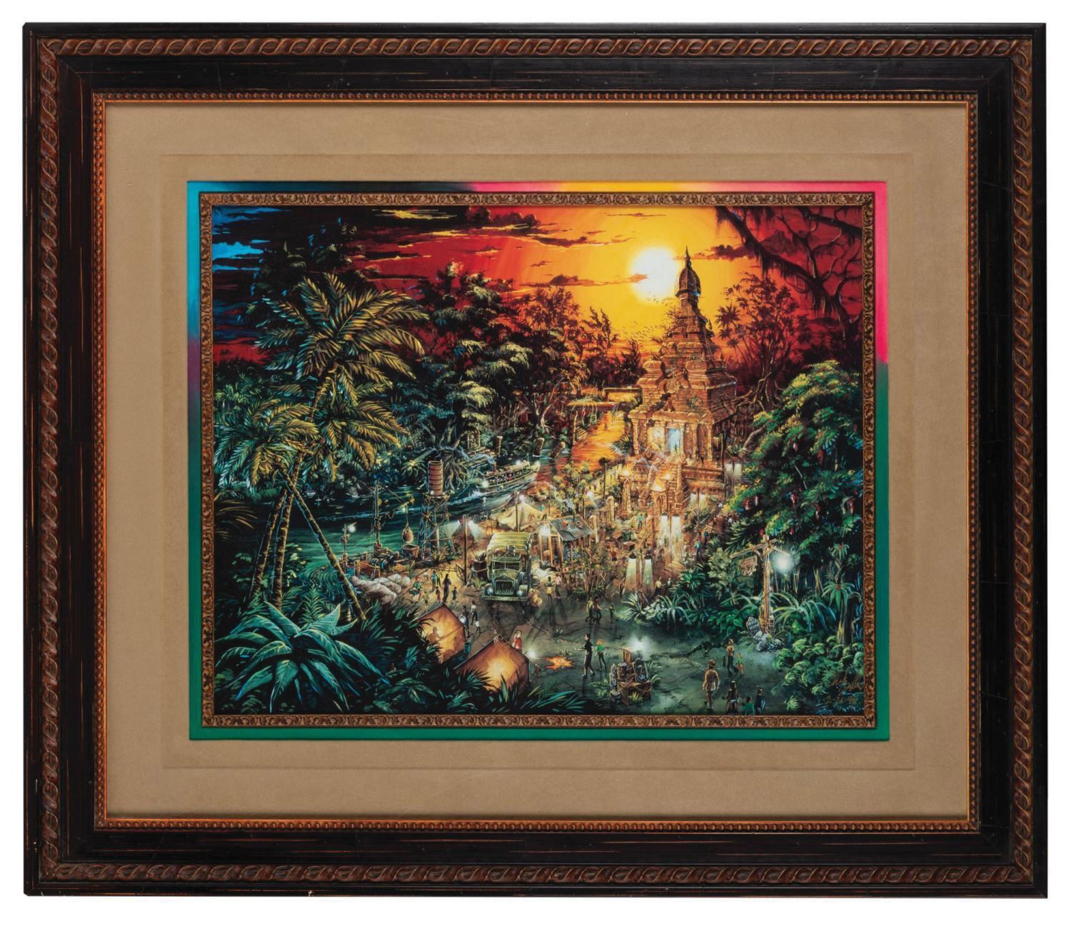 (Disneyland, 1993) An Indiana Jones Temple of the Forbidden Eye Excavation Site concept print by Walt Disney Imagineering Show Set Designer Chuck Ballew. Offered by The Disney Gallery, the print measures 37.25"x32.25". It is in fine condition, with only slight wear to the wooden frame's distressed motif. It is signed by Ballew and the original COA is included.