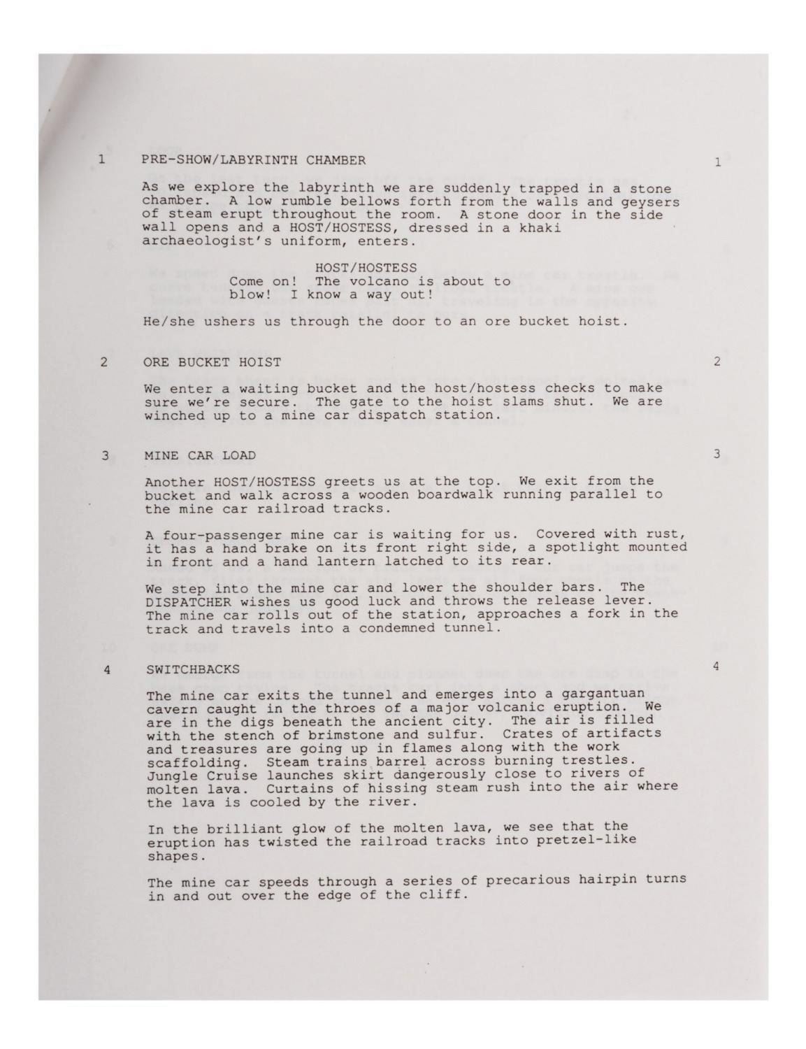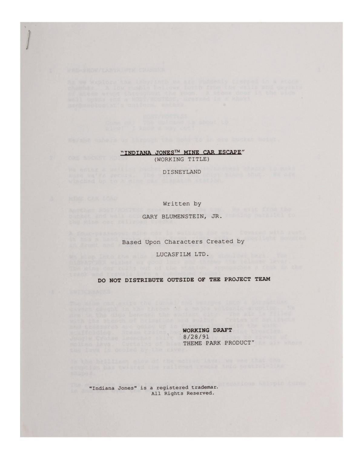 (Disneyland, 1991) A working draft of the Indiana Jones Mine Car Escape attraction script. Originally designed as a central feature of the proposed "Indiana Jones Adventures" attraction complex at Disneyland, the concept and script of this roller coaster would later inspire Indiana Jones et le Temple du Peril at Disneyland Paris. The 3-page script, written by Imagineer Gary Blumenstein, details the pre-show, mine car vehicles, guest loading procedure, and attraction elements. The 11"x8.5" script is in very fine condition.