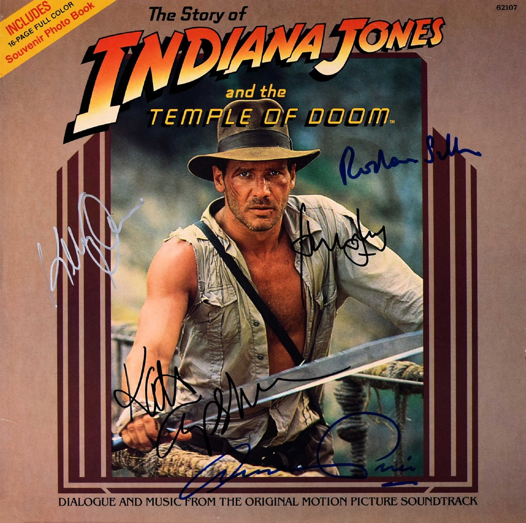 1984 Indiana Jones and the Temple of Doom Record Insert. Signed: Harrison Ford, Kat Capshaw, Roshan Seth, Amrish Puri, Dan Akroyd, David Yip & Ke Huy Quan.