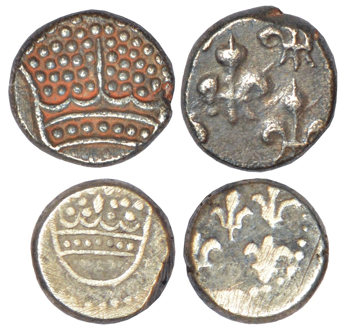 Indo-French, Pondicherry mint, silver coins (2), 1x fanon, KM 44, 1.44g and 1x ½ fanon, KM 39, 0.76g. Obv: Pearled crown. Rev: 5 fleur de-lis. (2 coins)