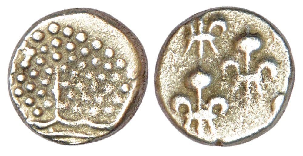 Indo-French, Pondicherry mint, silver fanon, KM 44, 1.38g. Obv: Pearled crown. Rev: 5 fleur de-lis.