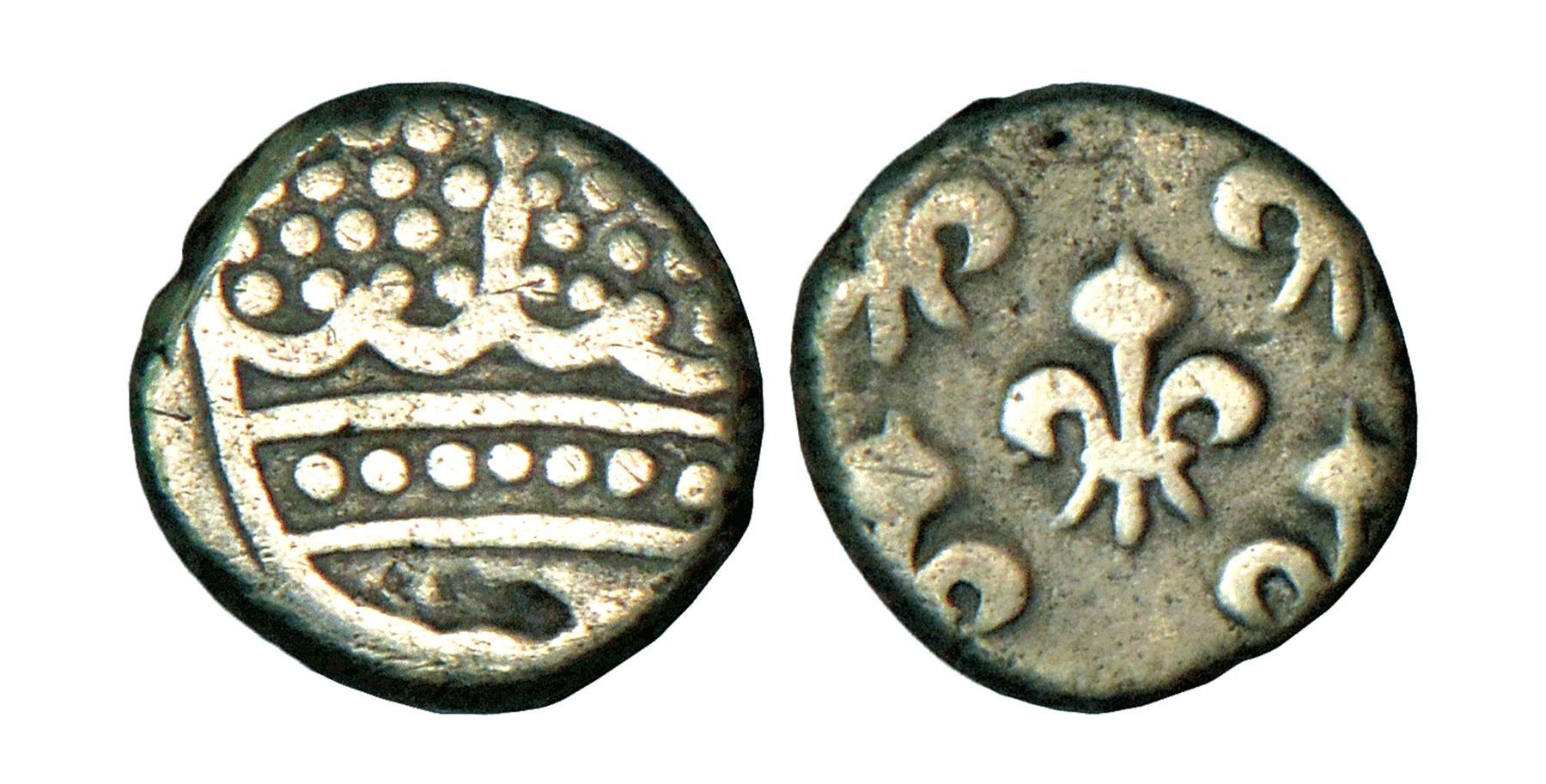 Indo-French, silver fanon, Pondicherry mint, ND (1760), 1.36g. Obv: Pearled crown. Rev: 5 Fleur-de-lis, KM 44, minor dent on reverse.