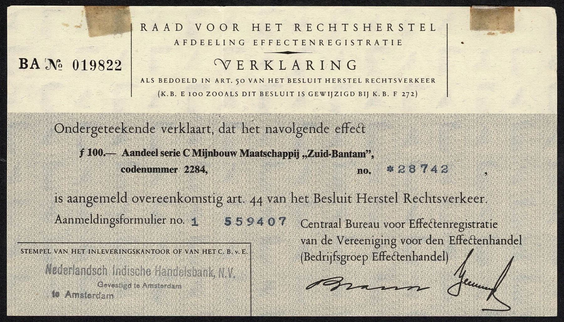 Indonesia 100 Gulden Mining Company South-Bantam Bond Netherlands Indies Commercial Bank Amsterdam
