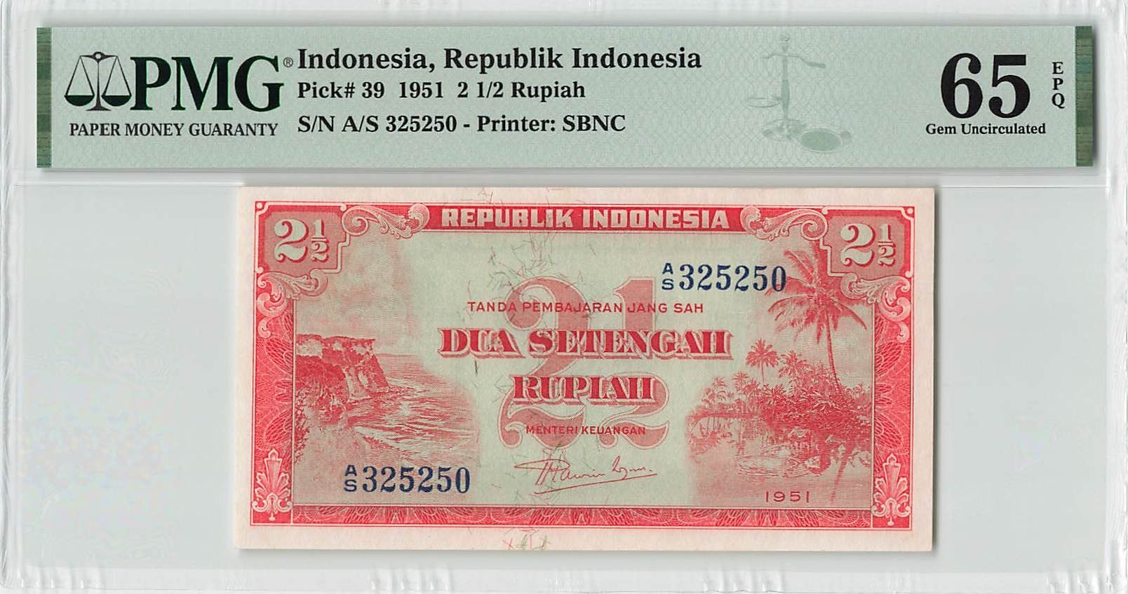 Indonesia 2½ Rupiah 1951 Pick 39 PMG Gem Uncirculated 65 EPQ