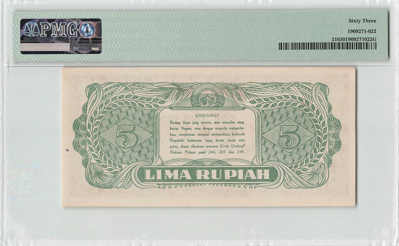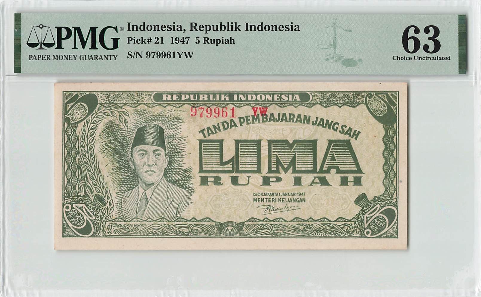 Indonesia 5 Rupiah 1947 Pick 21 PMG Choice Uncirculated 63