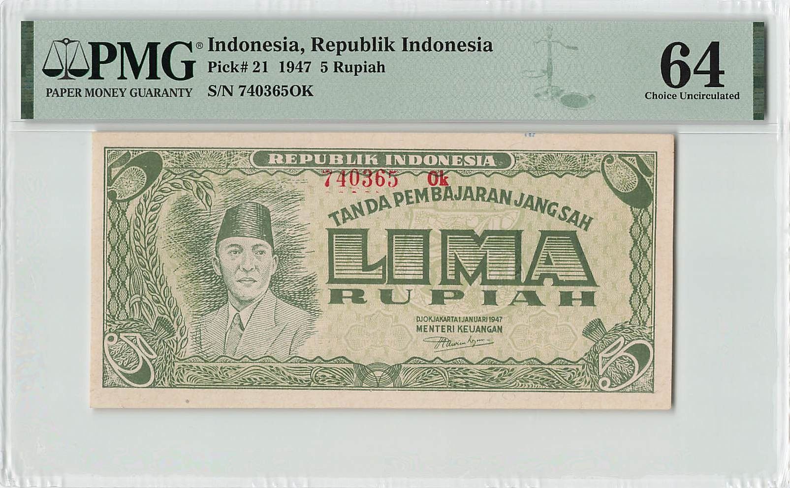Indonesia 5 Rupiah 1947 Pick 21 PMG Choice Uncirculated 64