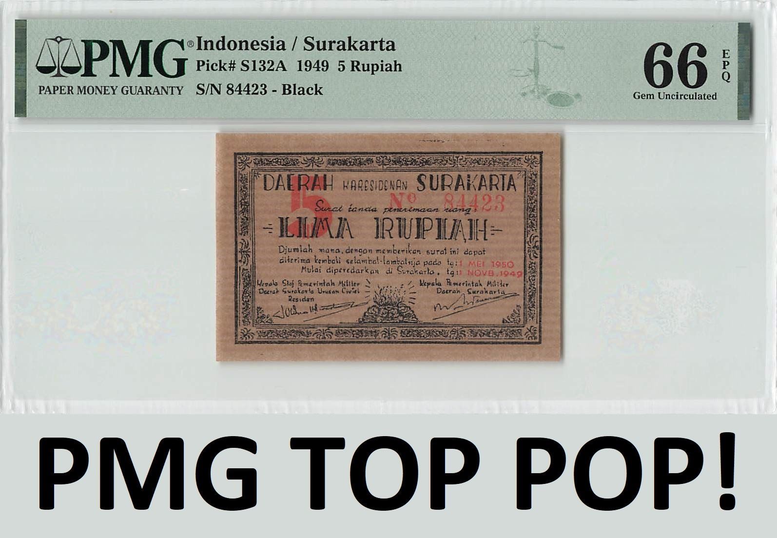 Indonesia 5 Rupiah 1949 Surakarta Pick S132A PMG Gem Uncirculated 66 EPQ TOP POP