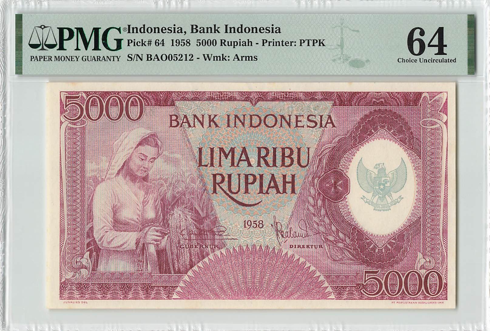 Indonesia 5000 Rupiah 1958 Pick 64 PMG Choice Uncirculated 64