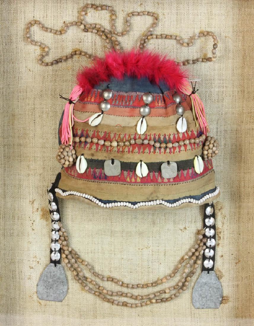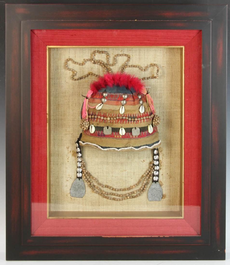 Indonesian framed headdress trimmed with shells and beads, view 16 1/2" x 13", framed 25 1/4' x 21 3/4". Provenance: Broomfield, Colorado estate.