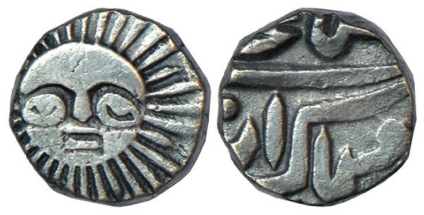 Indore, Shivaji Rao (1886-1903 AD), silver 1/8 rupee, 'big sun' type, Indore mint, in the name of Shah Alam II, KM 41, 1.39g.