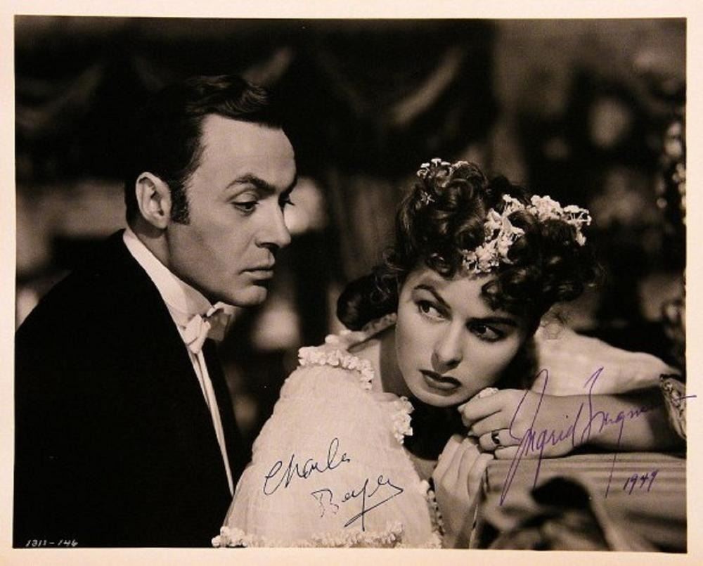 8 in. by 10 in. Black and white movie photo from "Gaslight" autographed as Ingrid Bergman 1949 and Charles Boyer.
