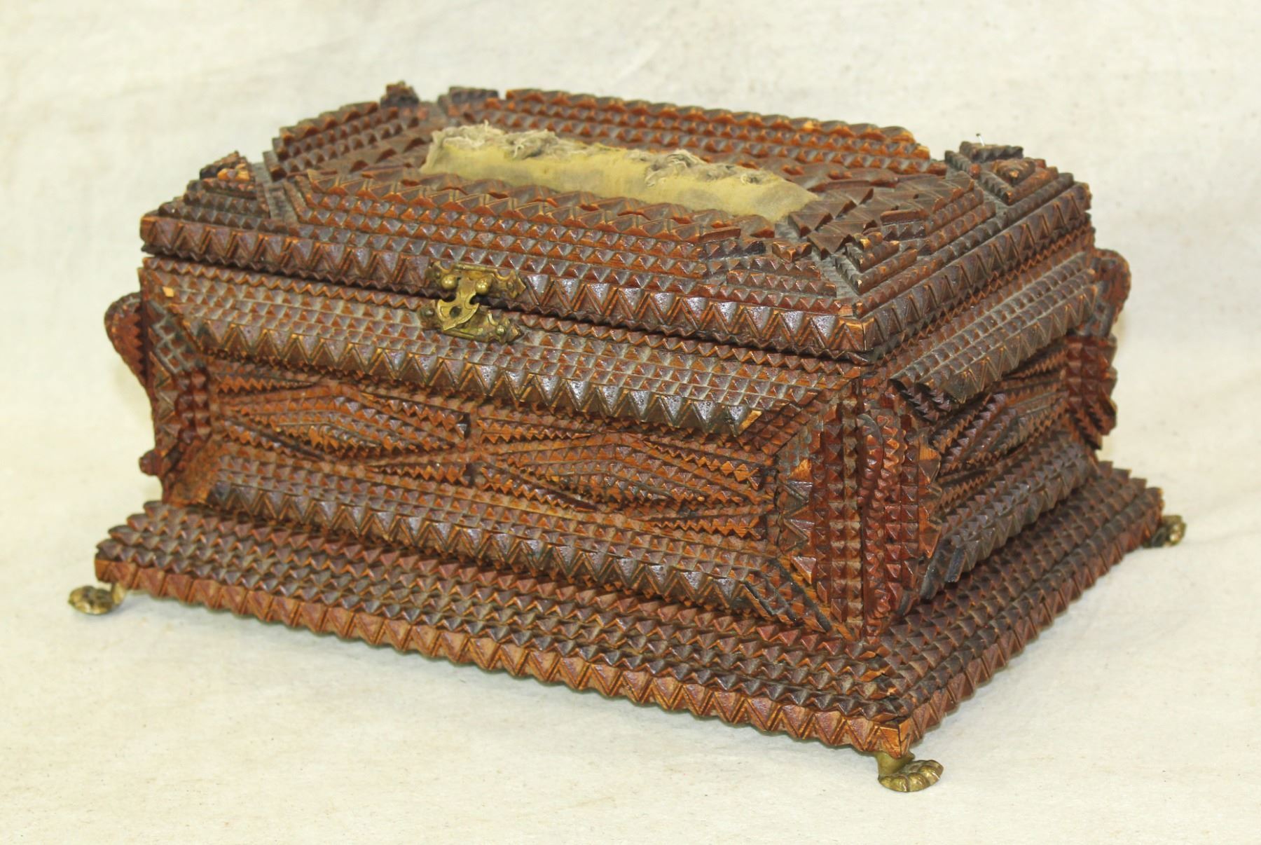 Antique Tramp Art box, a unique form of folk art craftmenship of layered and carved wood showing nice condition. Measuring 11"x 7"x 6".