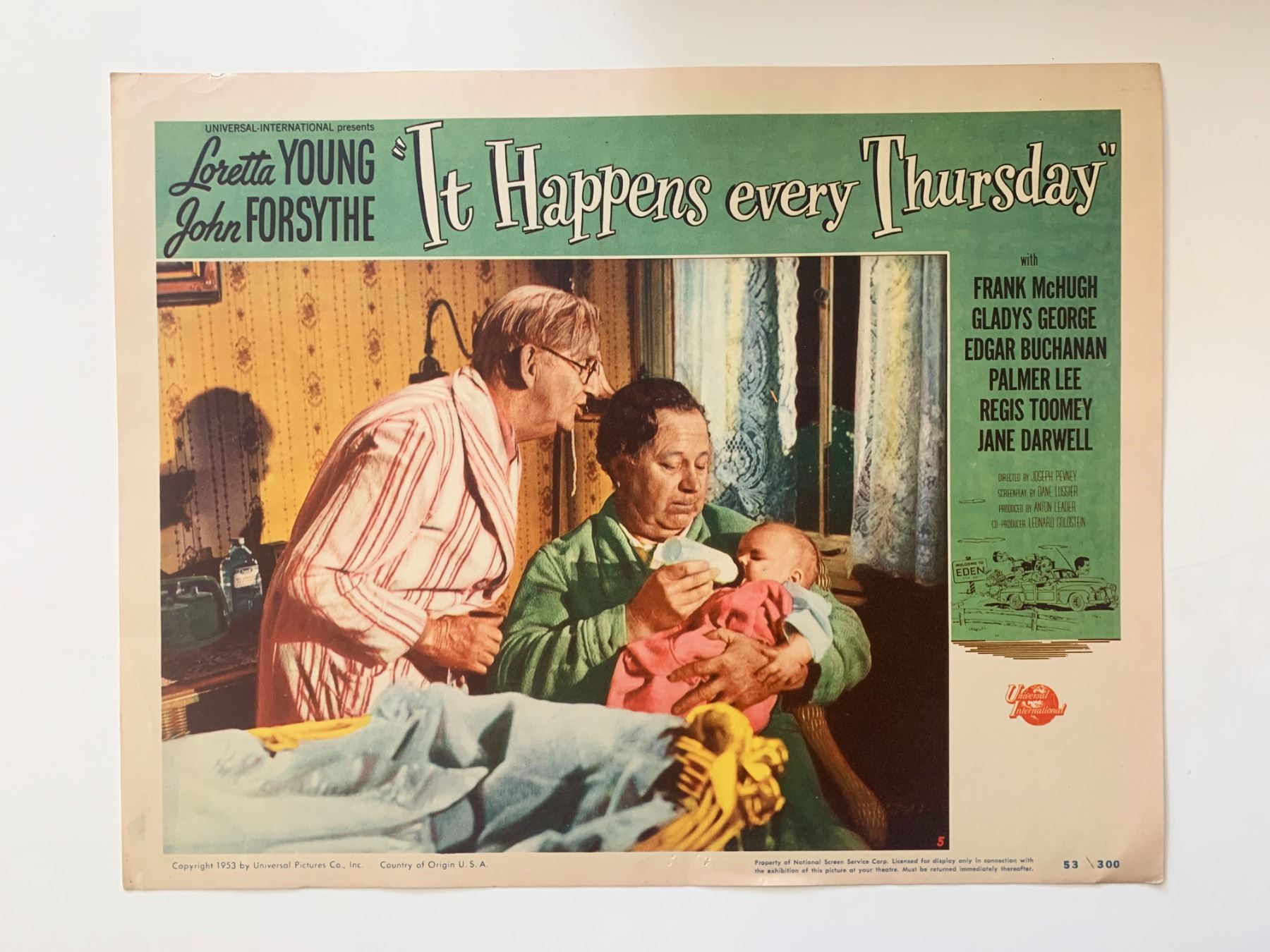 It Happens Every Thursday original 1953 vintage lobby card on heavy card stock. 11x14 inches