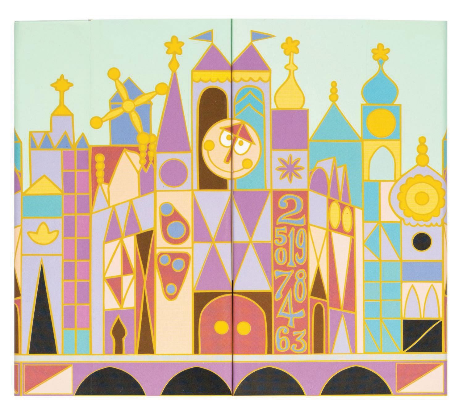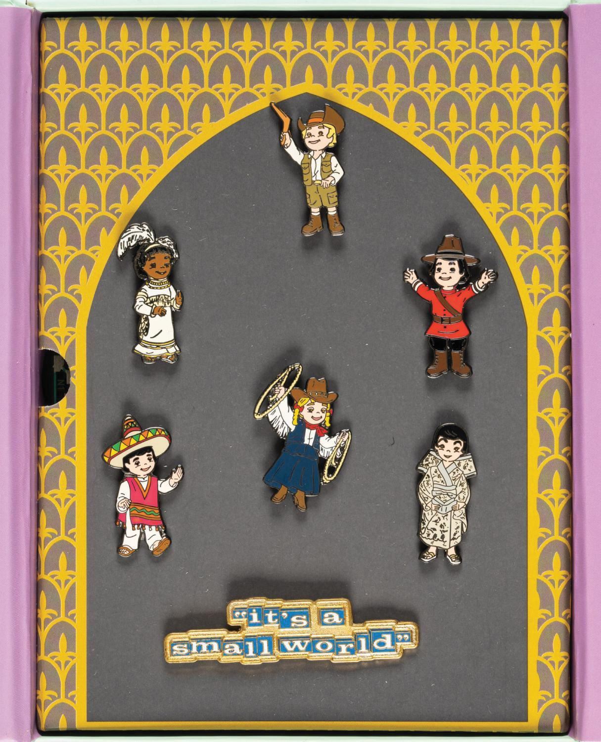 (Disneyland, 2001) An It's a Small World musical box pin set. The facade box opens to reveal (6) Children of the World pins and a Small World marquee pin, and plays the popular "It's a Small World" tune. Measuring under 2.5" each within a 6.5"x7.5" decorative box, the box and contents are in fine condition.