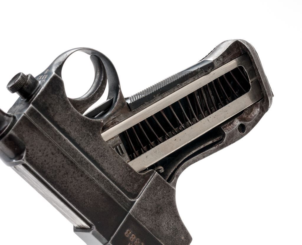 Italian Glisenti Model 1910 Semi-Automatic Pistol, #1888H, 9mm Glisenti cal., 3.94" barrel, blued finish, single left side black plastic grip, inverted "V" front sight and fixed "V"-notched rear sight. Marked on right side frame with "(crown)/FAB/1910" within a circled stamp. Top of slide marked with a circled "PB" symbol. Left side grip imprinted with Royal Italian crowned eagle, right side grip is missing. Matching numbers on frame, slide, barrel, and bolt. Condition overall is good with the frame retaining a small amount of its finish, now mostly bright with patina. Slide retains approx. 50% finish, now browning, with patina on the right side. Magazine shows patina to the floorplate, otherwise excellent. Action is smooth; bore has darkening in the lands, with worn rifling. No visible import marks. Est.: $500-$700. (C&R)
