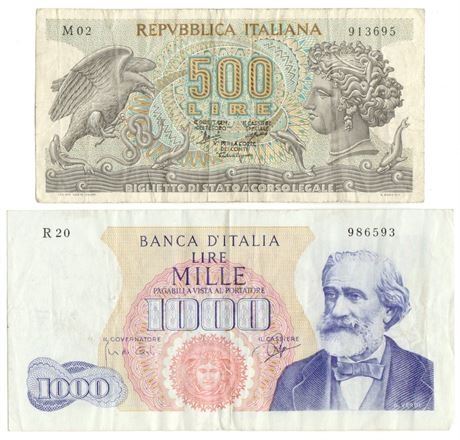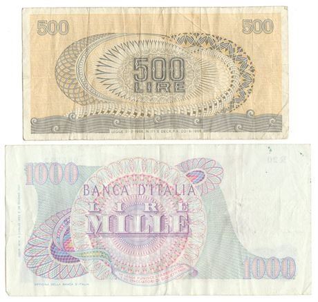 2 Notes Italy P#93 P#96 500 1,000 Lire Notes