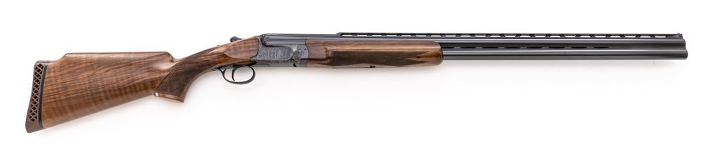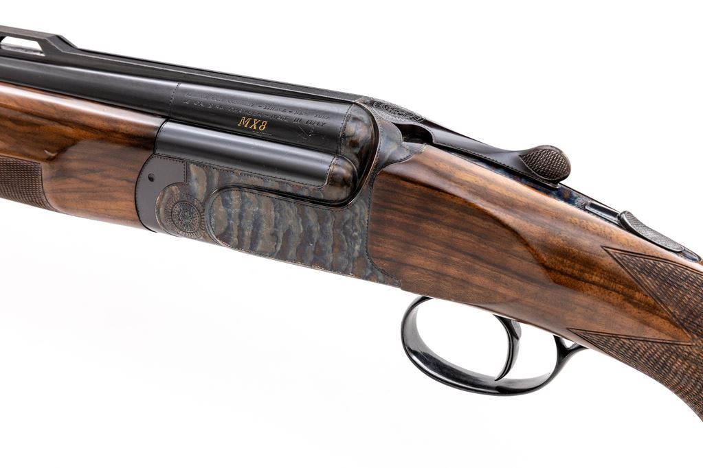 Ithaca/Perazzi Model MX-8 Over/Under Trap Shotgun, #41527. 12 ga. 30" barrels have target beads, high trap stepped vent rib, vent rib between barrels, 2-3/4" chambers, and are fitted for Perazzi choke tubes (approx. IC/Mod installed). Boxlock action features double locking lug, single non-selective inertia block trigger (bottom barrel fires first), non-automatic safety and auto ejectors. Receiver and top tang are case hardened, balance of metal is blued. Gold inlaid "MX8" on top barrel. Finger-groove beavertail Type 3 forend and pistol grip-Monte Carlo buttstock are oil-finished straight-grain European walnut, "B" Grade, with thorough checkering at 22 LPI, no grip cap, and a Perazzi target butt pad. Stock dimensions are 14-5/8"x1-1/2"x2-1/4". Imported by Ithaca for Perazzi in 1973. Condition is excellent as used very little. Wood has almost no handling marks, and receiver shows almost no edgewear. Action still locks very tight and functions perfectly; bores are bright. A very durable target gun. Est.: $5,000-$6,000. (Modern)(Denny Hayden collection)