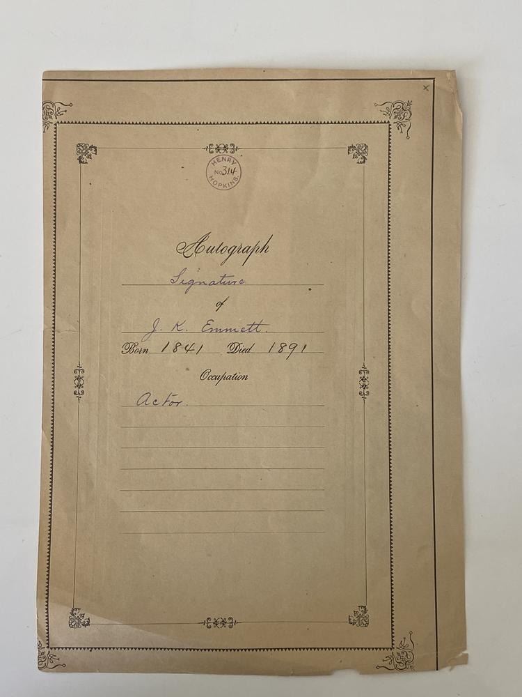 J.K. Emmett signed document. Henry Hopkins No.314. 8x10 inches