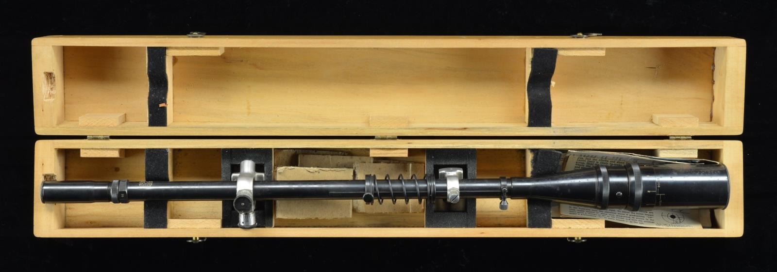S# 32737. 25 1/4" overall on 2 alloy external adj. turrets having recoil spring. Blue finish. Scope comes in Lyman Targetspot wooden case w/ Lyman scope adjustment instructions. CONDITION: Scope in good overall condition w/ turret friction wear & areas of peppery oxidation. Slightly cloudy, but serviceable optics. Case in very good condition w/ moderate marks throughout. (02-16691/MD). $300-800.
