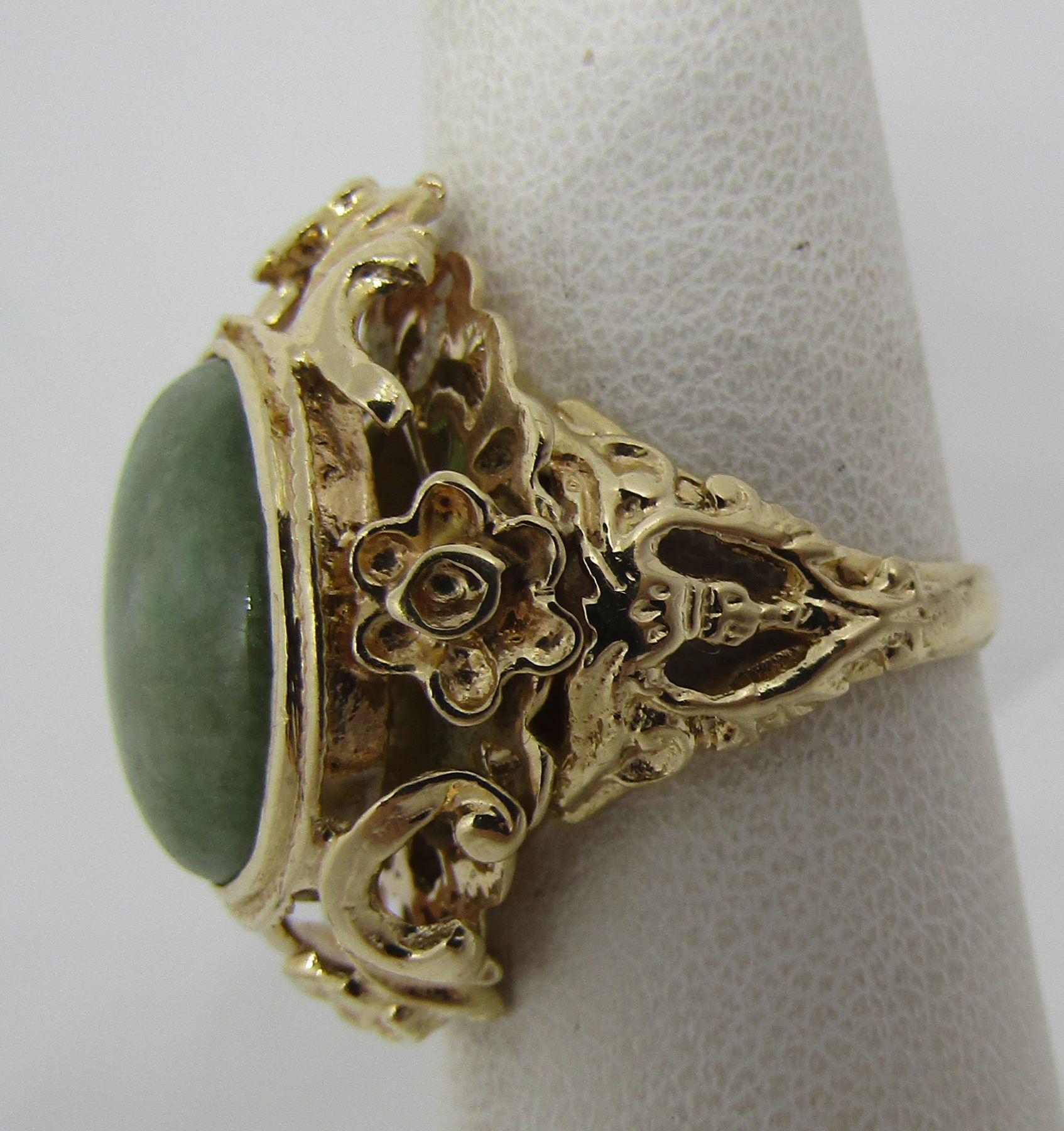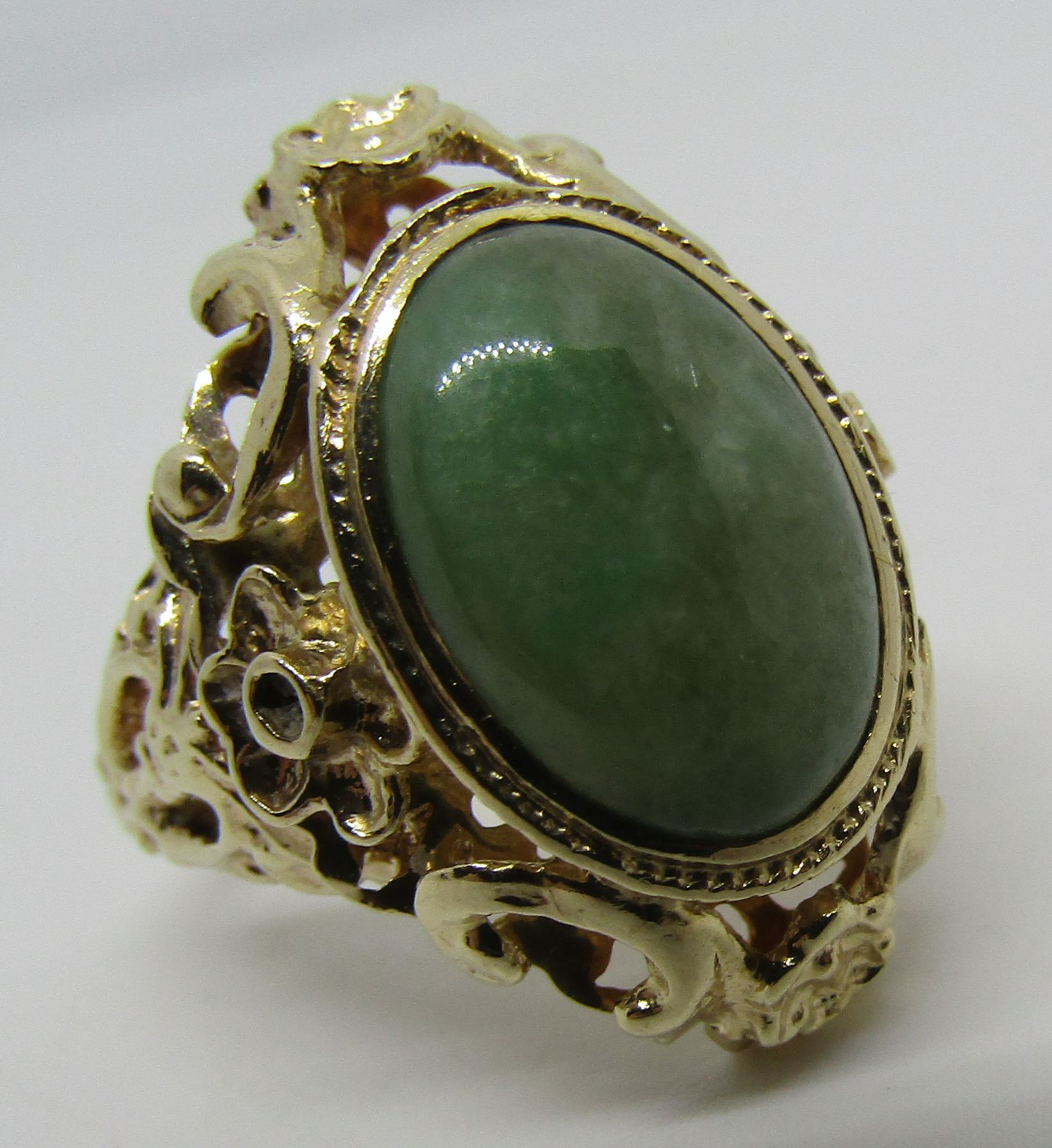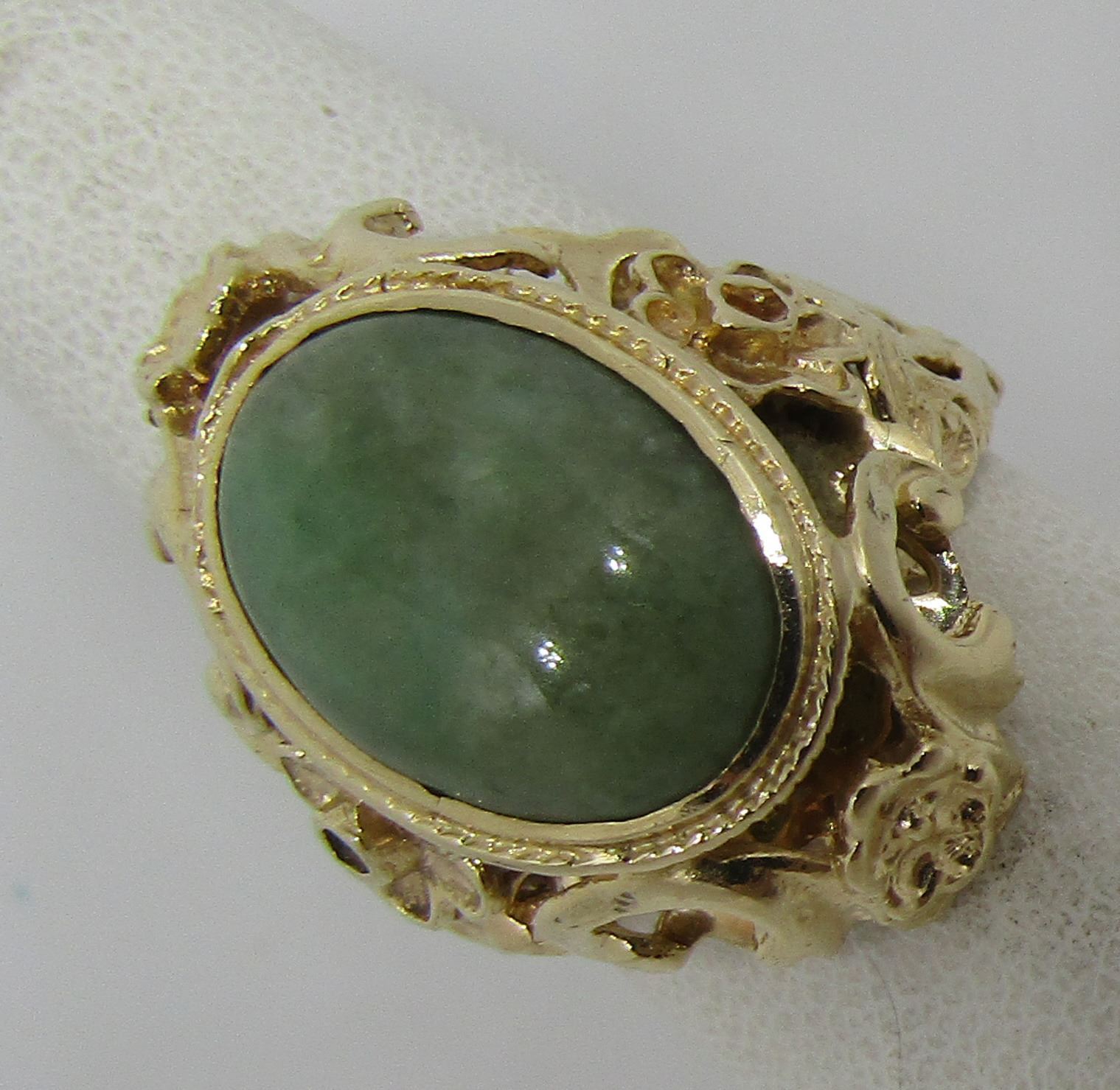 GENUINE JADE RING. MARKED "14K" GOLD, WEIGHS 7.6 GRAMS. 24 MM WIDE. SIZE 6.5. EXCELLENT CONDITION VINTAGE ESTATE. USA SHIPPING $8