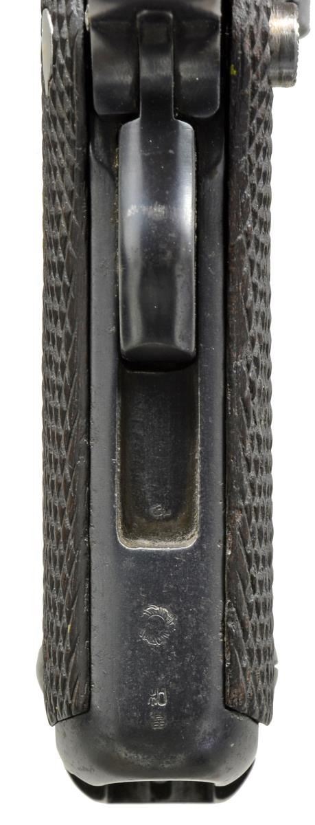 PISTOL. Cal. 8mm Nambu. S# 1924. Bbl. 119mm. Approx. 2,400 mfg. 1903-1906. First batch of 1,500 for Japan & portion of next group for Thailand w/ Thai markings. Later, the pistol was modified & referred to as “Papa” variation which was commonly slotted for shoulder stock. This pistol has curved trigger of Grandpa variation rather than squared trigger of Papa. Proper Grandpa tangent sight numbered 1-5. Chamber has intertwined cannonball symbol of Tokyo Koshikawa Arsenal. Right rear of receiver w/ 3 Japanese characters translating to “Nambu type”. Additionally has between safety slot & bottom of front strap a circular Thai charkra symbol. Top rear of frame w/ recessed panels of second batch. Matching numbered cocking piece & bolt that is numbered twice (each side of cross slot). Derby & Brown’s “Japanese Military Cartridge Handguns 1893-1945” reference book indicates Grandpas have 4.5mm extractor & Papas are 5mm, as is the extractor on this pistol. Coarsely checkered walnut grips w/out markings on back. Lanyard loop swivels; not fixed in straight rearward position. Small faint proof marks at bottom of grip safety slot & bottom of front strap. MAGS: 1 early nickel plated wood bottomed 8 rd. numbered 2274; very good condition. UNATTACHED ACCESSORIES: large reconditioned stock/holster w/ matching numbers that are restamped over unreadable prior number. Underside of hinged buttplate has black inked “2”. Stock has provision for spare mag. but not for cleaning kit. Attachment latch works fine, but telescoping latch sticks. CONDITION: very good to excellent appearance having some high point wear consistent w/ being in stock/holster. High point finish loss on grip screws. Nice appearing right grip w/ slight diamond top hand wear. Left grip exhibits more wear to diamond tops & has a distinct horizontal line just above mag. release. Slight thinning of finish along top of mainspring housing. Extractor & trigger w/ minimal remaining straw colors. Peppery oxidation on grip straps. Good plus bore w/ light wear & even light frosting. (20-1958/NW). CURIO. $12,000-18,000.