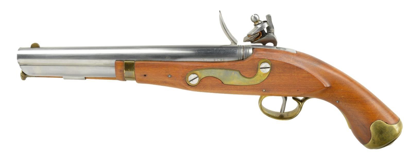 Cal. 54. S# 5019. Bbl. 9" smoothbore w/ brass blade front sight. In the white lock & bbl. Lock has eagle w/ "US" in front of hammer. Hardwood stock w/ brass parts. Brass tipped ramrod. CONDITION: good plus overall w/ sm. cracks, oxidation & marks. Good bore. (01-20999/MD). ANTIQUE. $100-200.