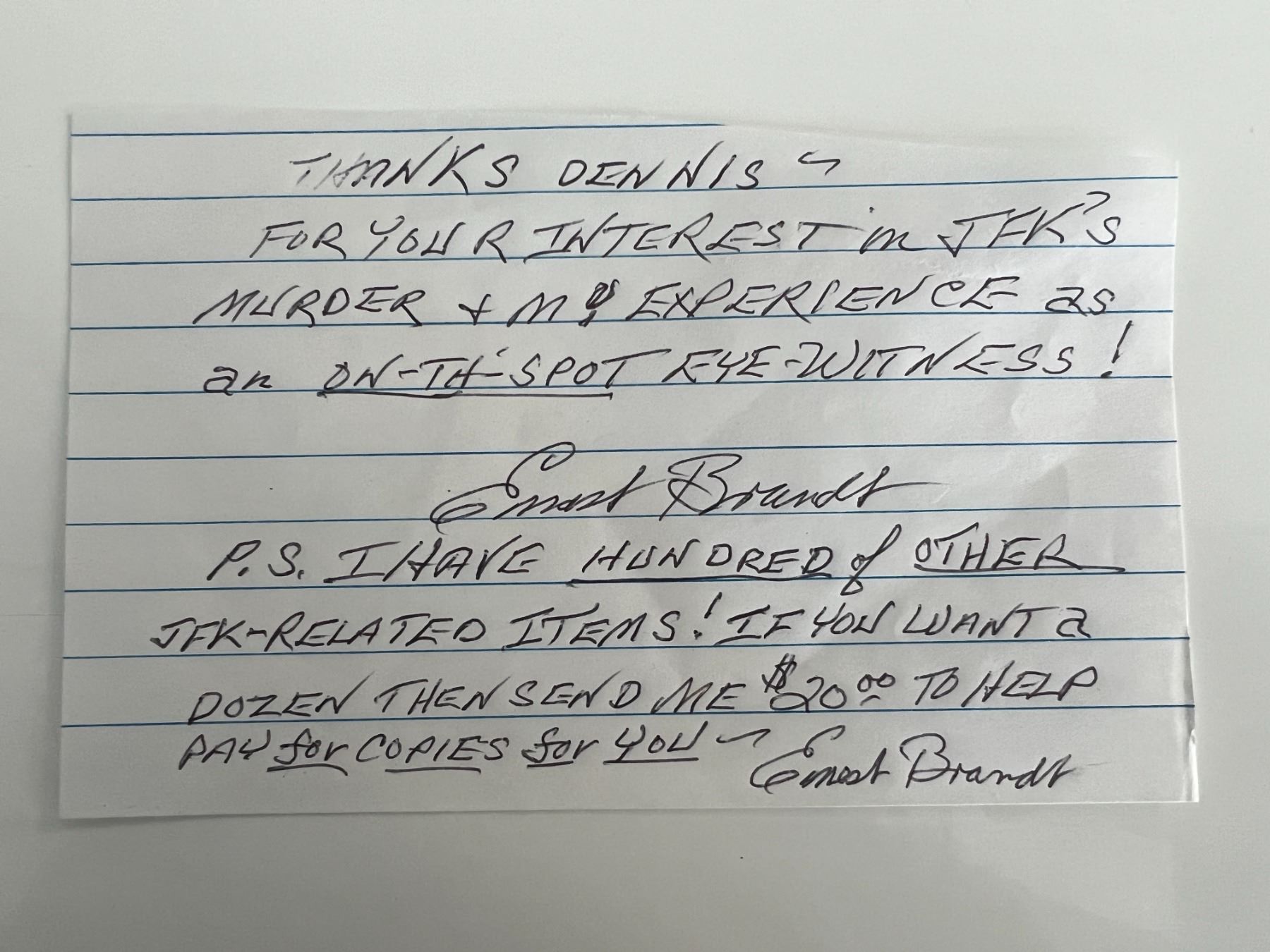JFK Assassination Ernest Brandt signed note.6x4 inches