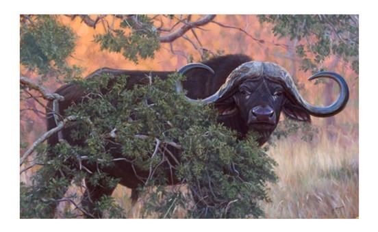 “Hunting my first cape buffalo, with Phillip Reed of Zambezi Hunters in the Save Conservancy, was a life changing experience. Over several days of stalking the 150 plus herd of Nyati, I was never so aware of every sound and smell - all my senses seemed as if they were electrified. Even though we were trying to get close enough for a clean shot, I could not help but be transfixed by the golden, even light juxtaposed with the steel umber hue of the buffalo torsos....and the shimmer of sunlight on their horns seemed as if they wore “helmets of black gold". The intimacy one attains with a buffalo during such a hunt is etched in your mind for life.” - John Banovich