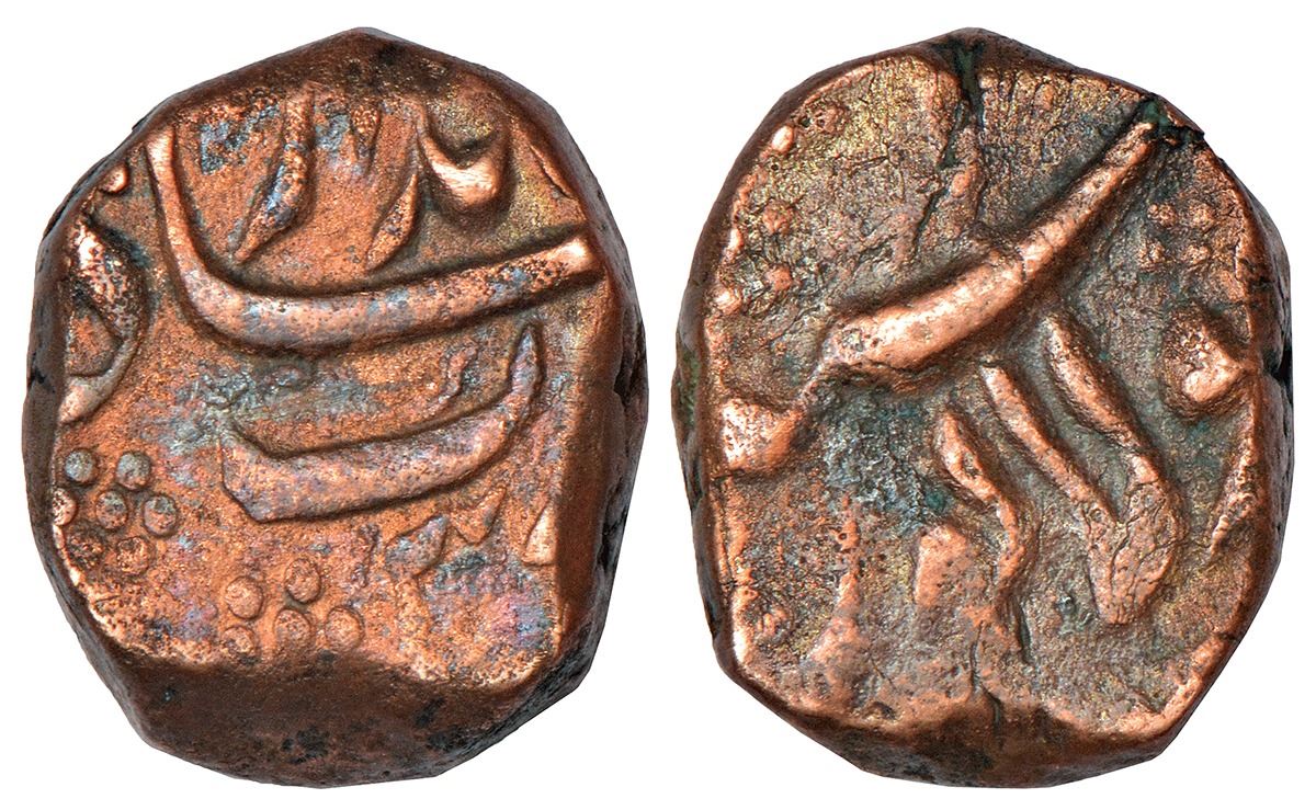 Jahandar Shah (1712-1713 AD), light-weight copper dam, Solapur mint, 13.78g. Obv: Legend Falus Jahandar Shah. Rev: Mint name and Sanha.