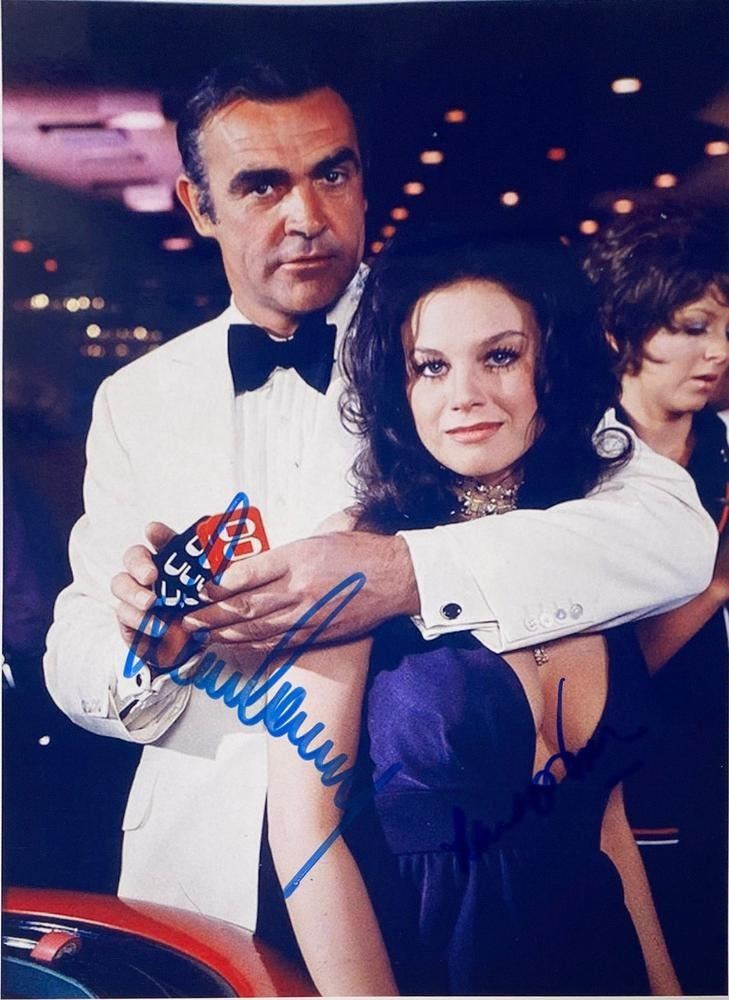 James Bond Diamonds Are Forever facsimile signed photo autographed by Sean Connery and Lana Wood. 8x10 inches. This item is a reprint of an original autograph