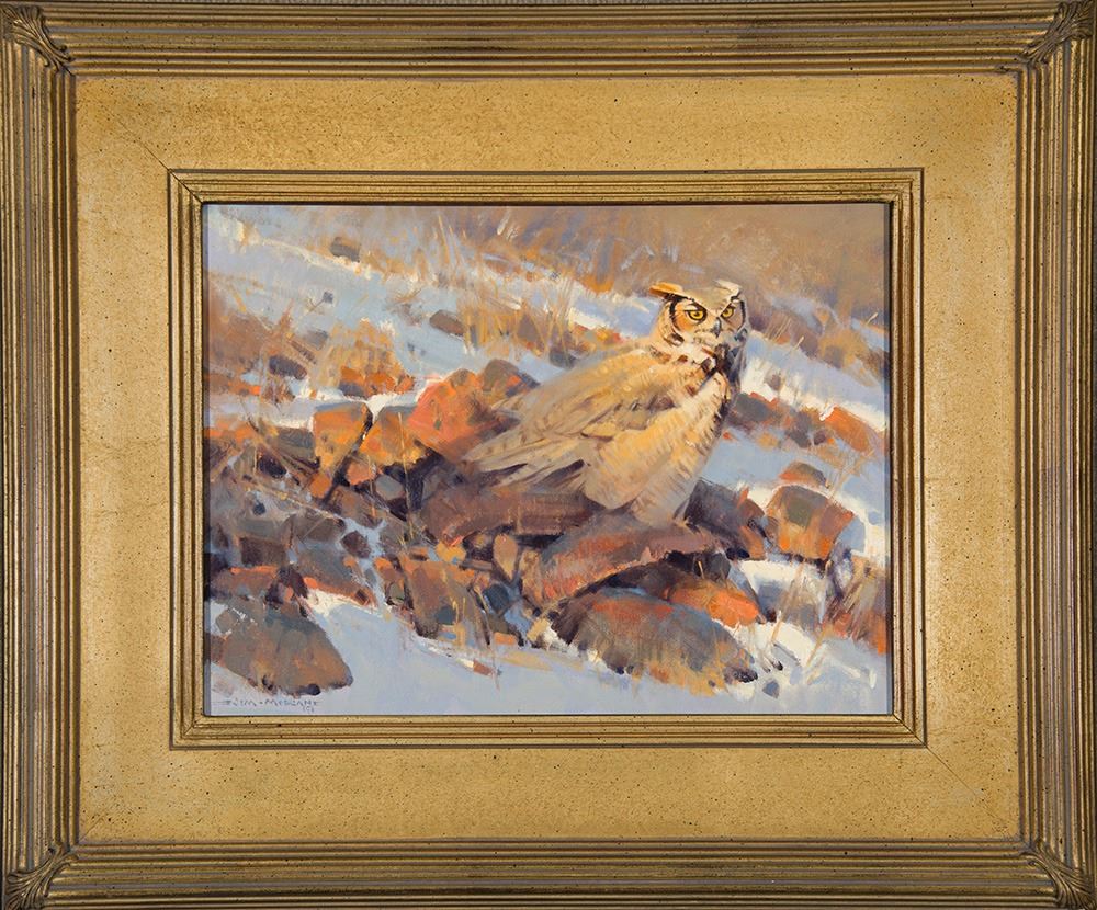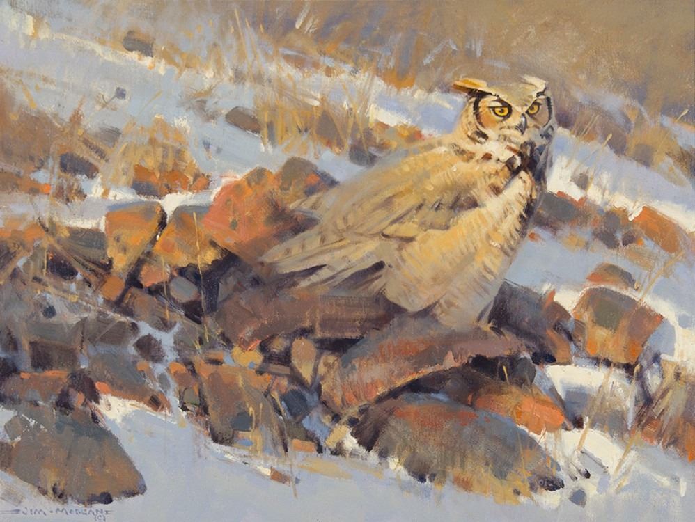Artist: James Morgan; Title: Great Horned Owl; Medium: Oil on board; Dimensions: 12 x 16 inches; Signed: Signed lower left; Verso: Signed verso; Framed/Base: 21 x 25 inches