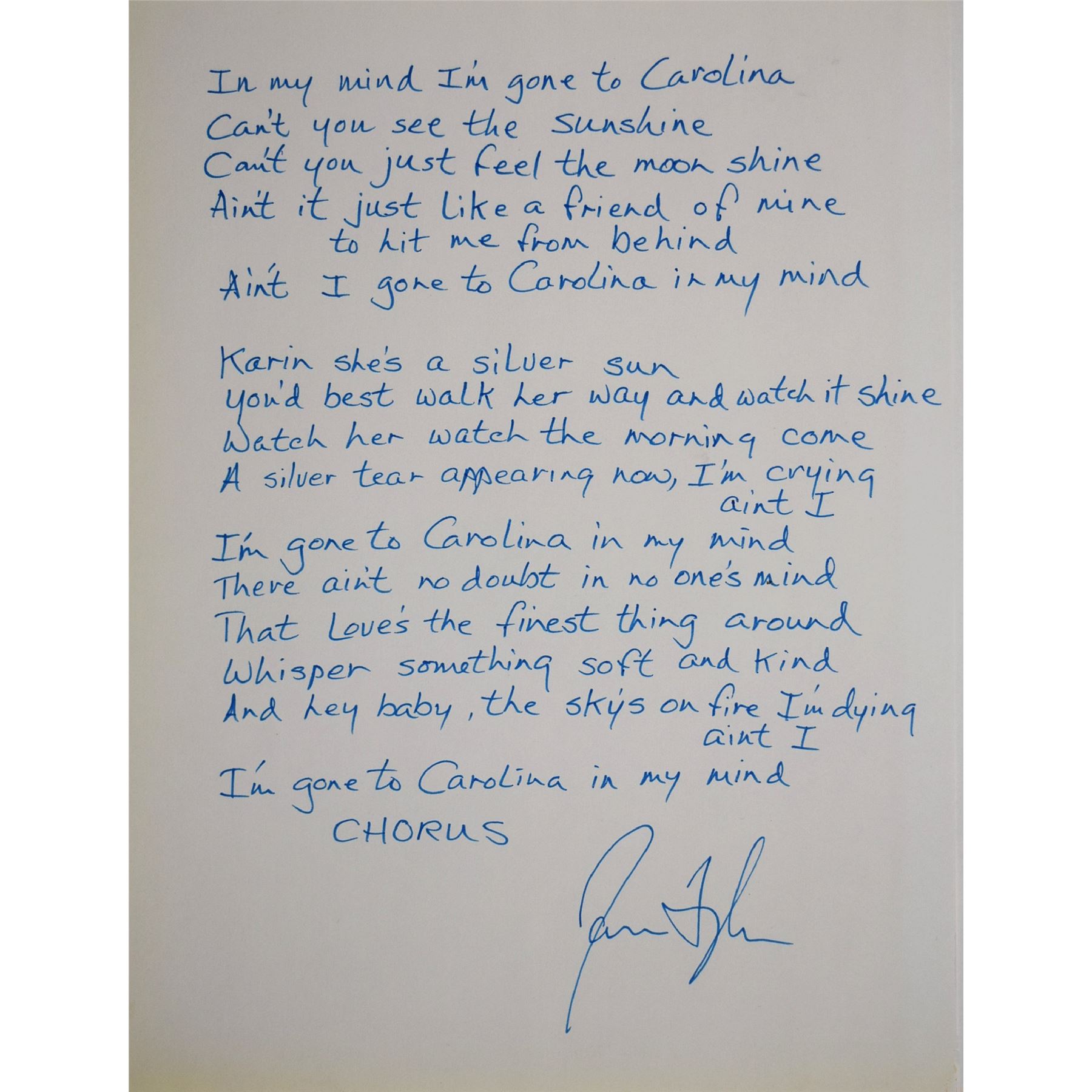 8 1/4 in. by 11 in. Handwritten Carolina In My Mind Lyrics signed James Taylor.