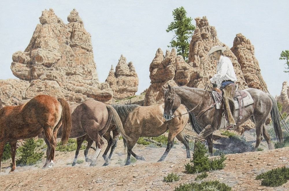 Artist: Jamie Means; Title: Gathering the Mares; Medium: Colored pencil; Dimensions: 17 1/2 x 26 1/2 inches; Signed: Signed and dated 09 lower left; Framed/Base: 27 x 36 inches