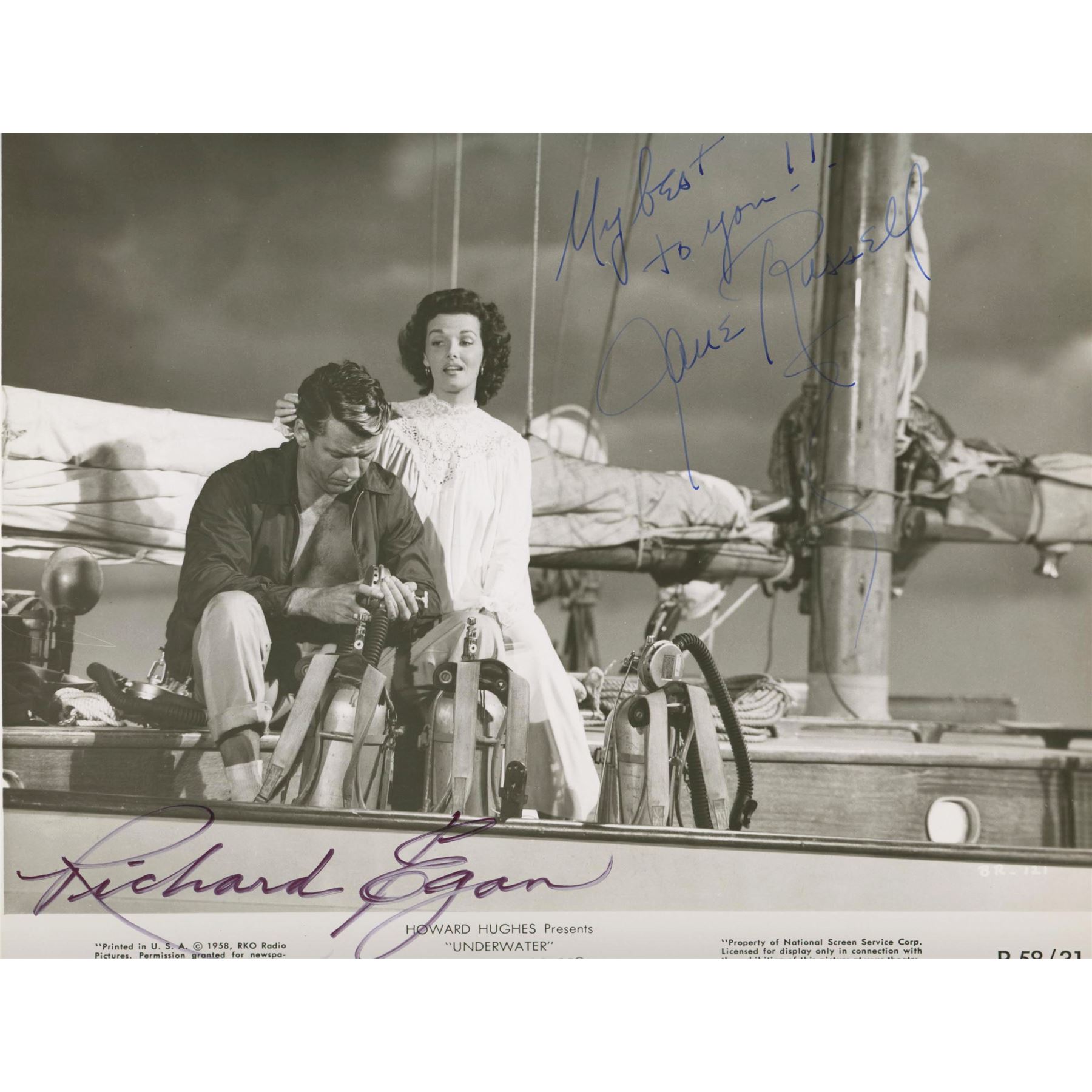 Underwater signed movie photo autographed by Jane Russell and Richard Egan. 8x10 inches