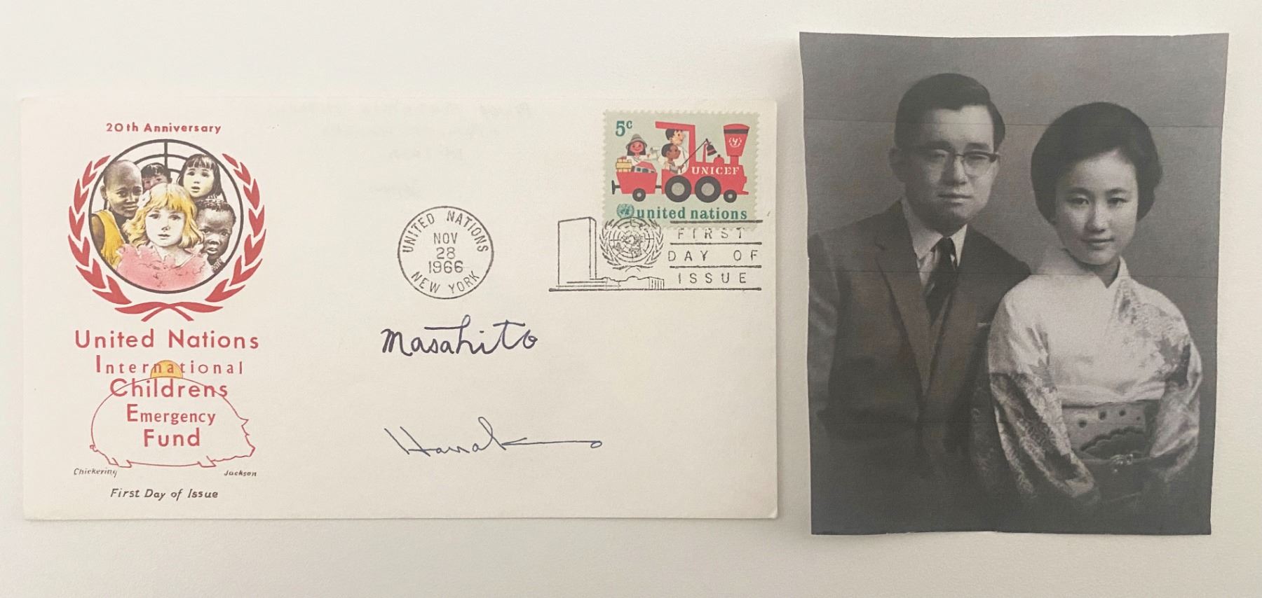 Masahito, Prince Hitachi and Hanako, Princess Hitachi Japanese Imperial Family signed 1966 United Nations, New York First Day Cover with Photo. 3x6inches and 3x4inches