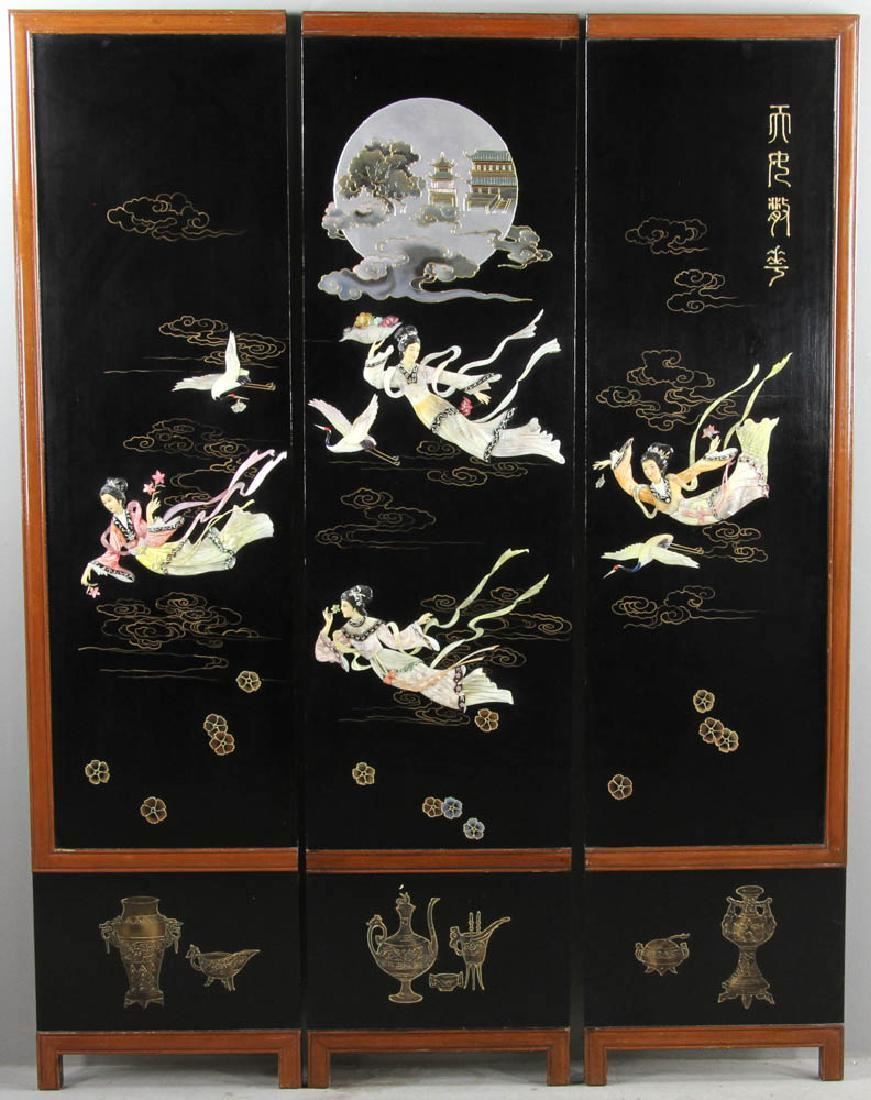 Japanese three-panel lacquered screen with mother-of-pearl inlay, 74" x 54". Provenance: Greenbaum estate.