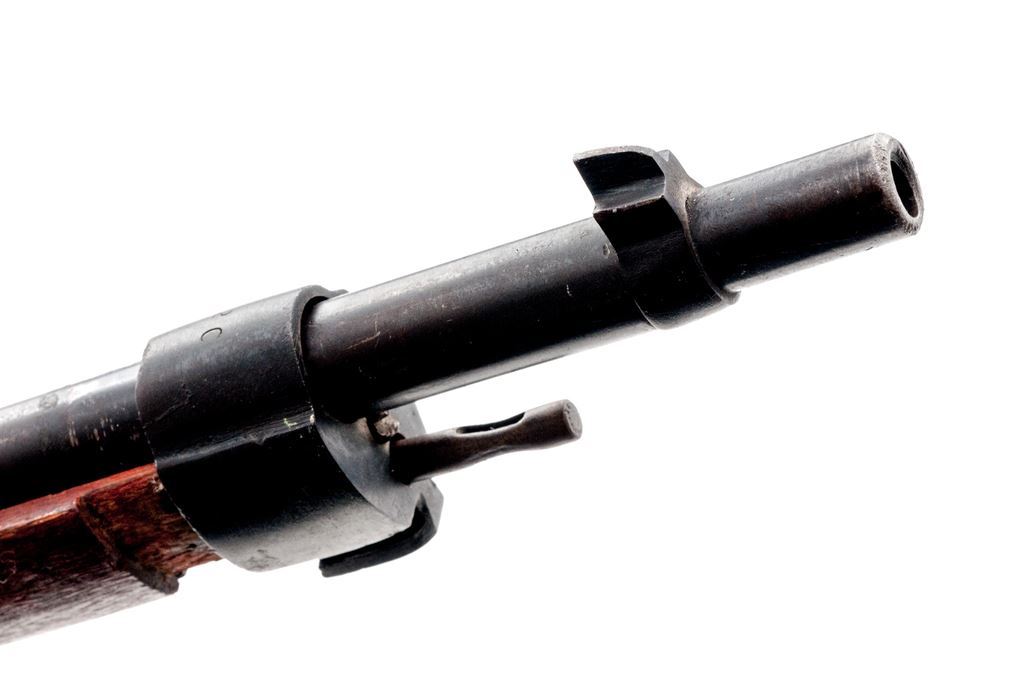 Japanese Type 38 Arisaka Training Rifle, #720, 6.5x50mm Blank cal., 30" barrel, blued finish, hardwood two-piece stock, inverted "V" front sight and folding leaf rear sight. No markings on receiver. Matching numbers on receiver and bolt handle. Japanese language instruction stamp on right side of buttstock and painted characters on left side buttstock. Rifle is made for training only as the barrel is smooth bored and designed to fire blank ammunition. There are no locking lugs on the bolt and the safety does not function. Condition overall is good with the metal retaining approx. 70% finish, showing areas of browning and patina. The lower buttstock has separated but is still in place. Wood is good overall showing handling marks to the brown stained finish. Action is rough but the bolt will lock into place; bore is dark. Est.: $200-$300. (C&R)