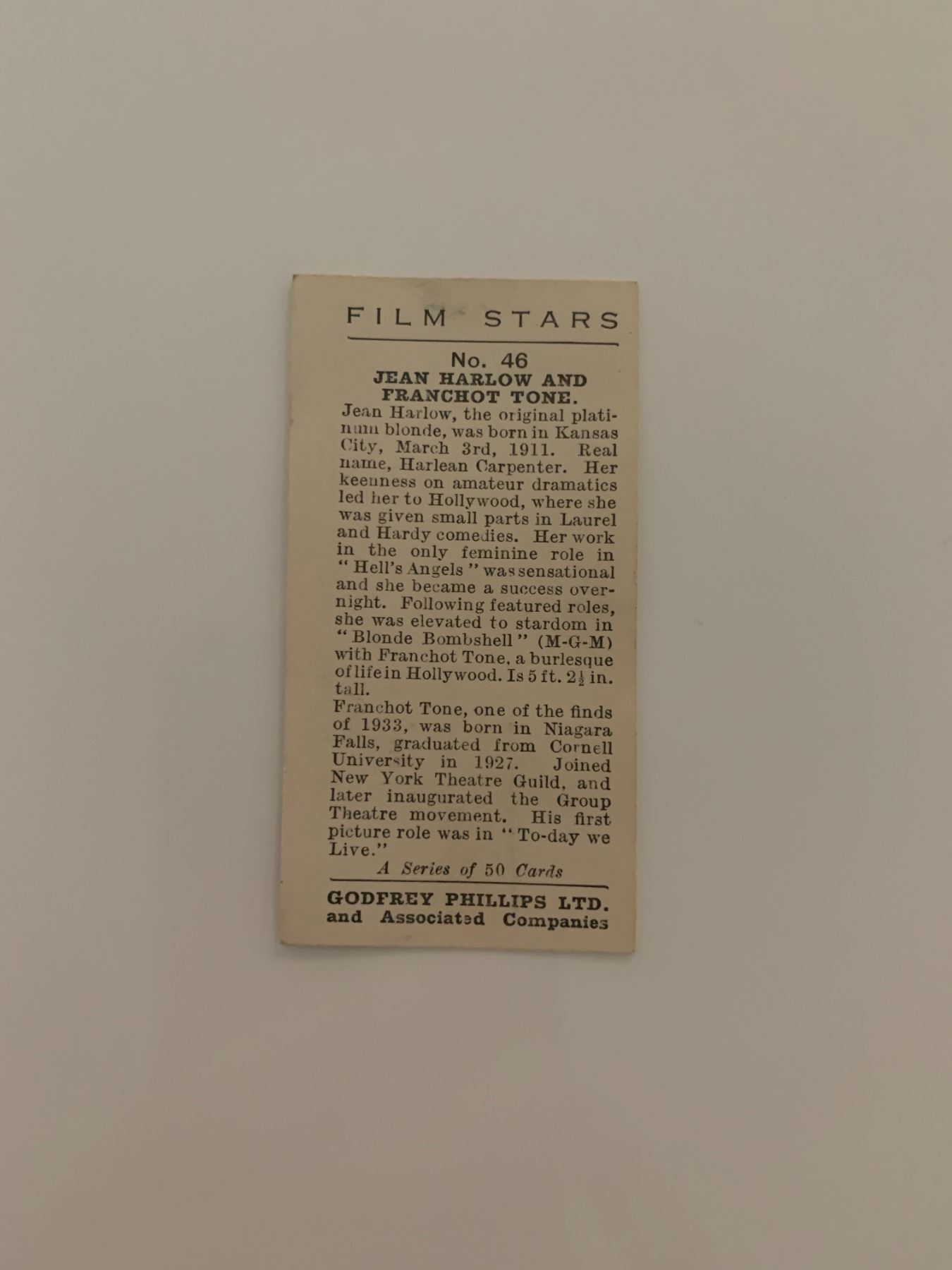 Jean Harlow and Franchot Tone unsigned cigarette card