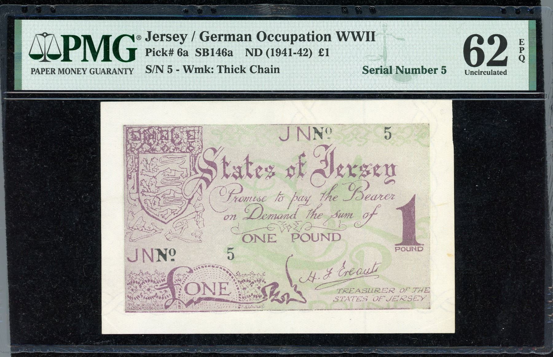 Jersey One Pound P.6a (1941-42) with thick chain watermark, issued under German Occupation, PMG certified UNC-62 with astounding serial number "5". Almost certainly the lowest-numbered surviving example of this interesting issue, and a rare opportunity for the Channel Islands specialist.