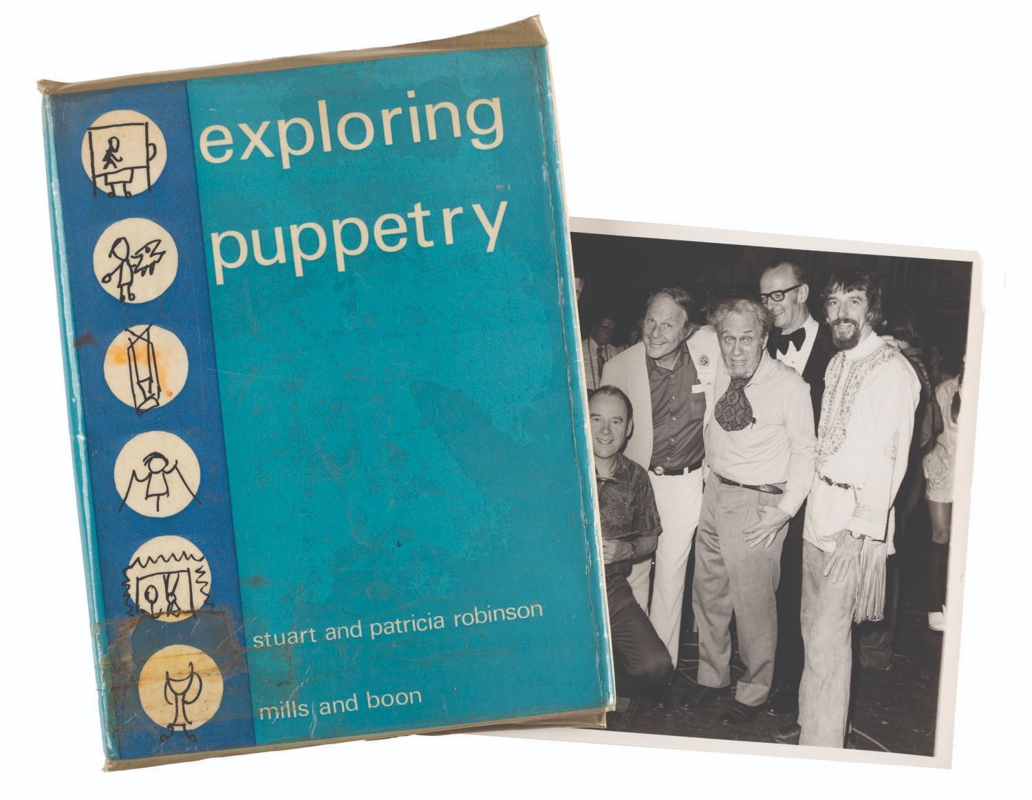 (Henson, 1970s) Jim Henson’s print of a photo with cherished puppeteer colleagues and a copy of "Exploring Puppetry,” both from his office. The photo taken at the 1974 Puppeteers of America National Festival shows Henson with Caroll Spinney (Big Bird), Jim Gamble, Albrecht Roser, Burr Tillstrom (Kukla, Fran, and Ollie), Bill Baird (The Sound of Music), and Jay Marshall. The book "Exploring Puppetry” is an ex-library copy from Cardiff, England that Henson possessed. The 8” x 10” photo is in very good condition. The 7.5” x 10” book with dust jacket is in fair condition with heavy wear to the protective cover, and a strong odor from storage.