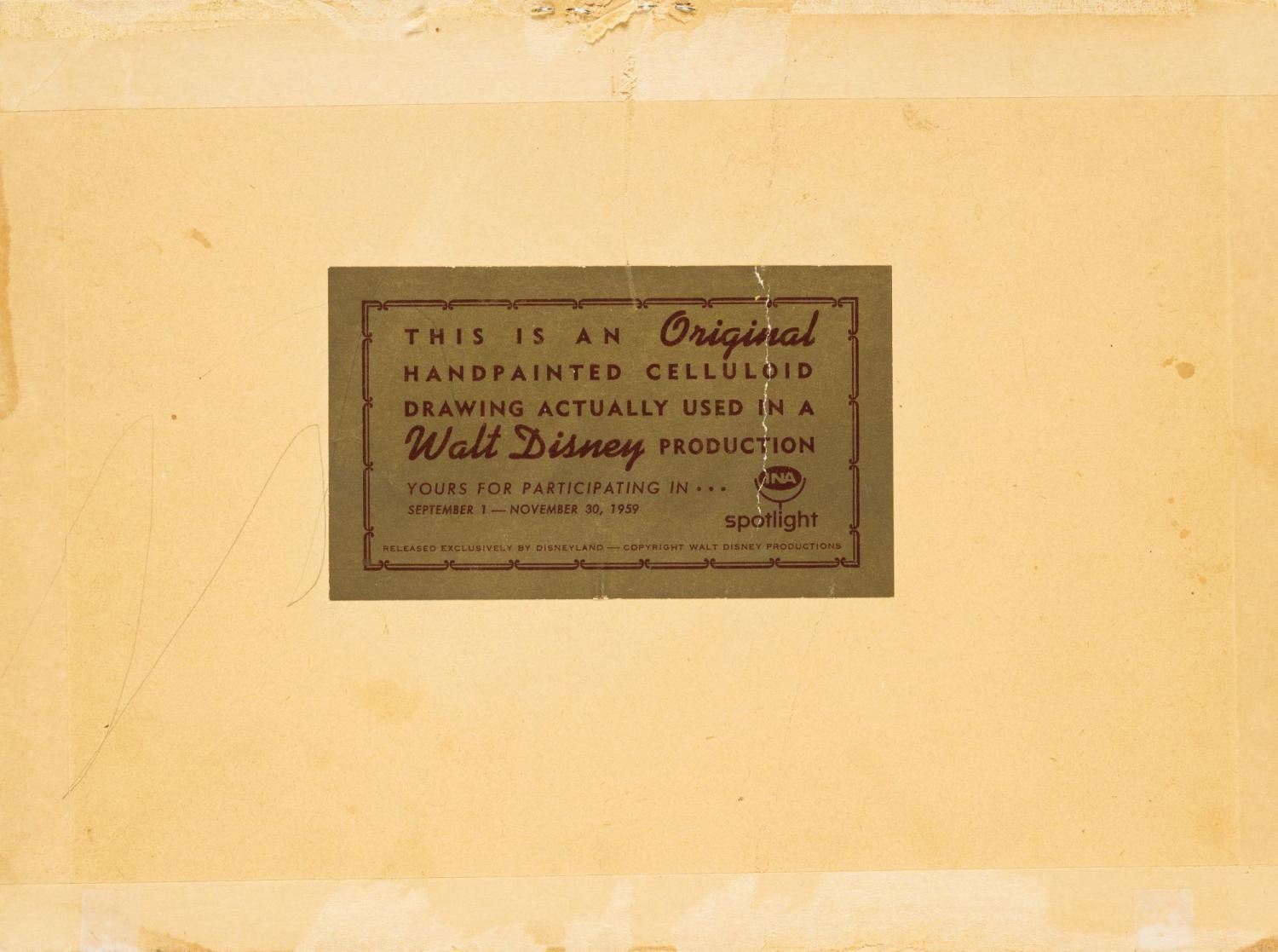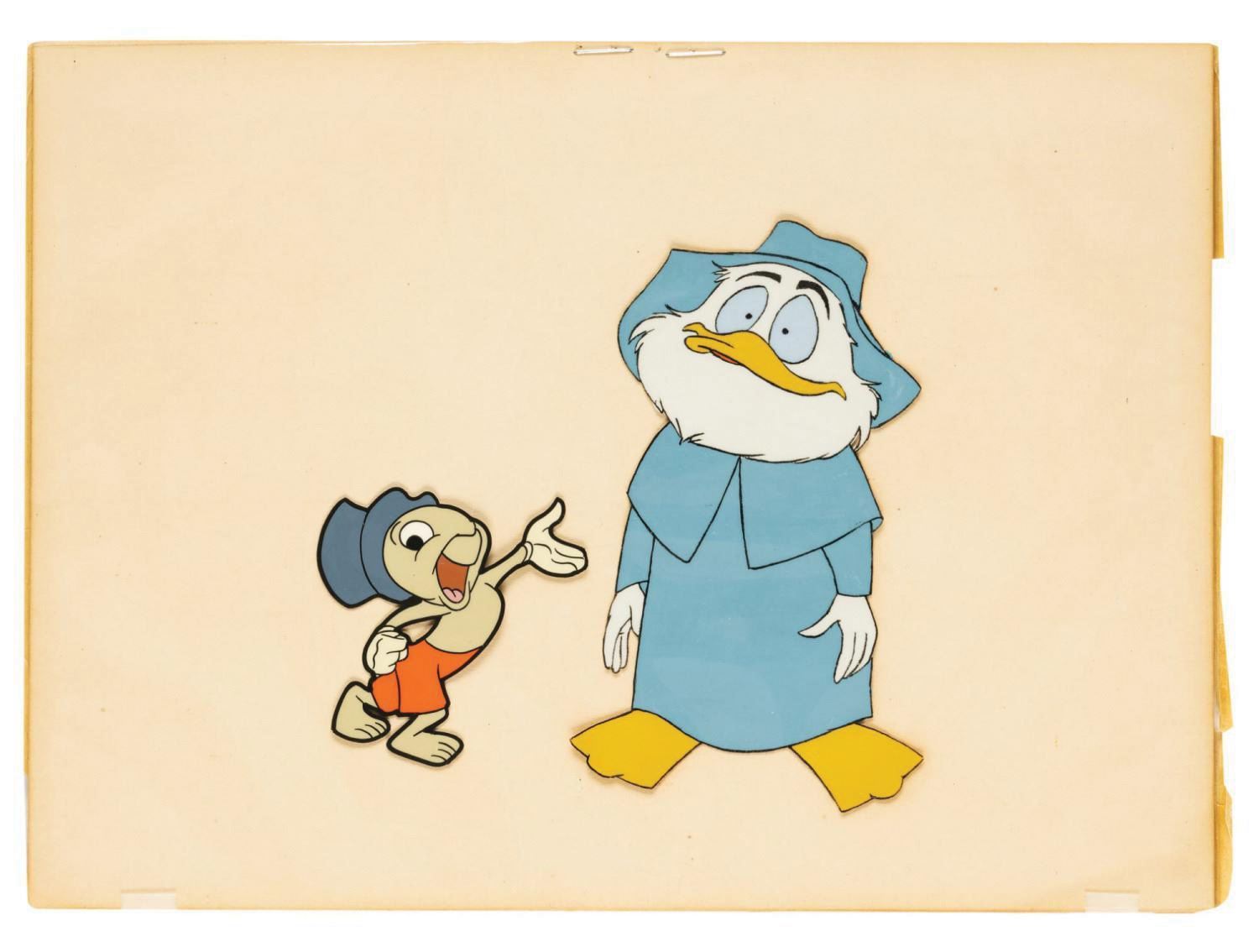 (Disney, 1956/59) An animation cel set-up depicting Jiminy Cricket and J.J. Fate. The Jiminy cel is from "I'm No Fool in Water" and J.J. Fate is from "How to Have an Accident at Work." These cels were trimmed and assembled for sale at the Art Corner in Disneyland. The piece has a combined painted character size of 5"x5.25" on the 7.5"x10" cel sheets. The set-up displays in very good condition, exhibiting minimal wear, and retaining a Disneyland label on the reverse.
