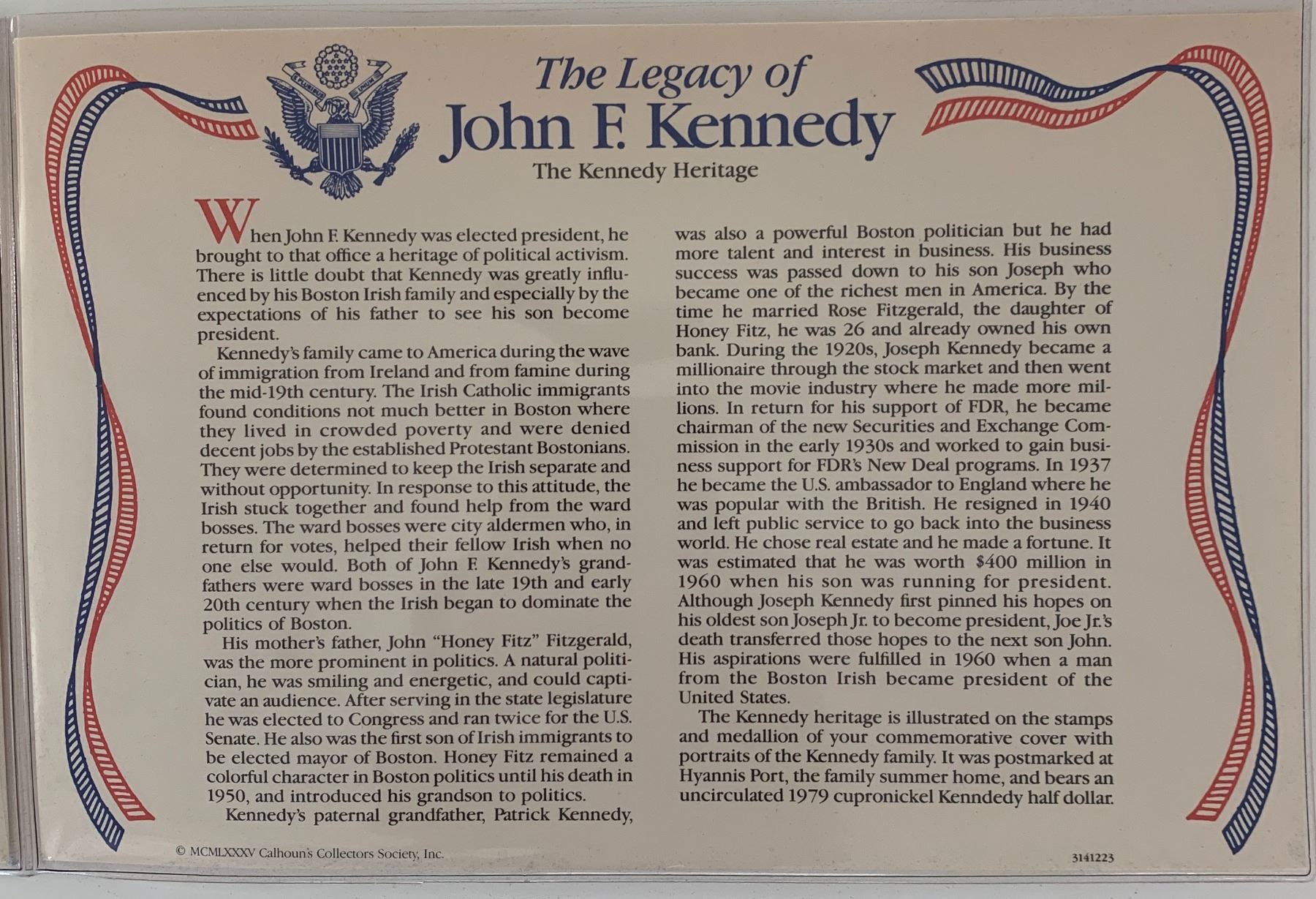 John F. Kennedy commemorative cover featuring artwork, stamps, medallion and uncirculated half dollar. 6x9 inches