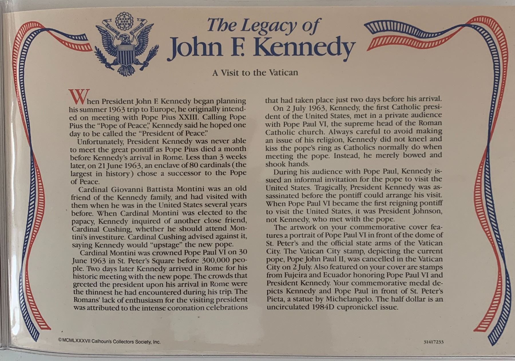 John F. Kennedy commemorative cover featuring artwork, stamps, medallion and uncirculated half dollar. 6x9 inches
