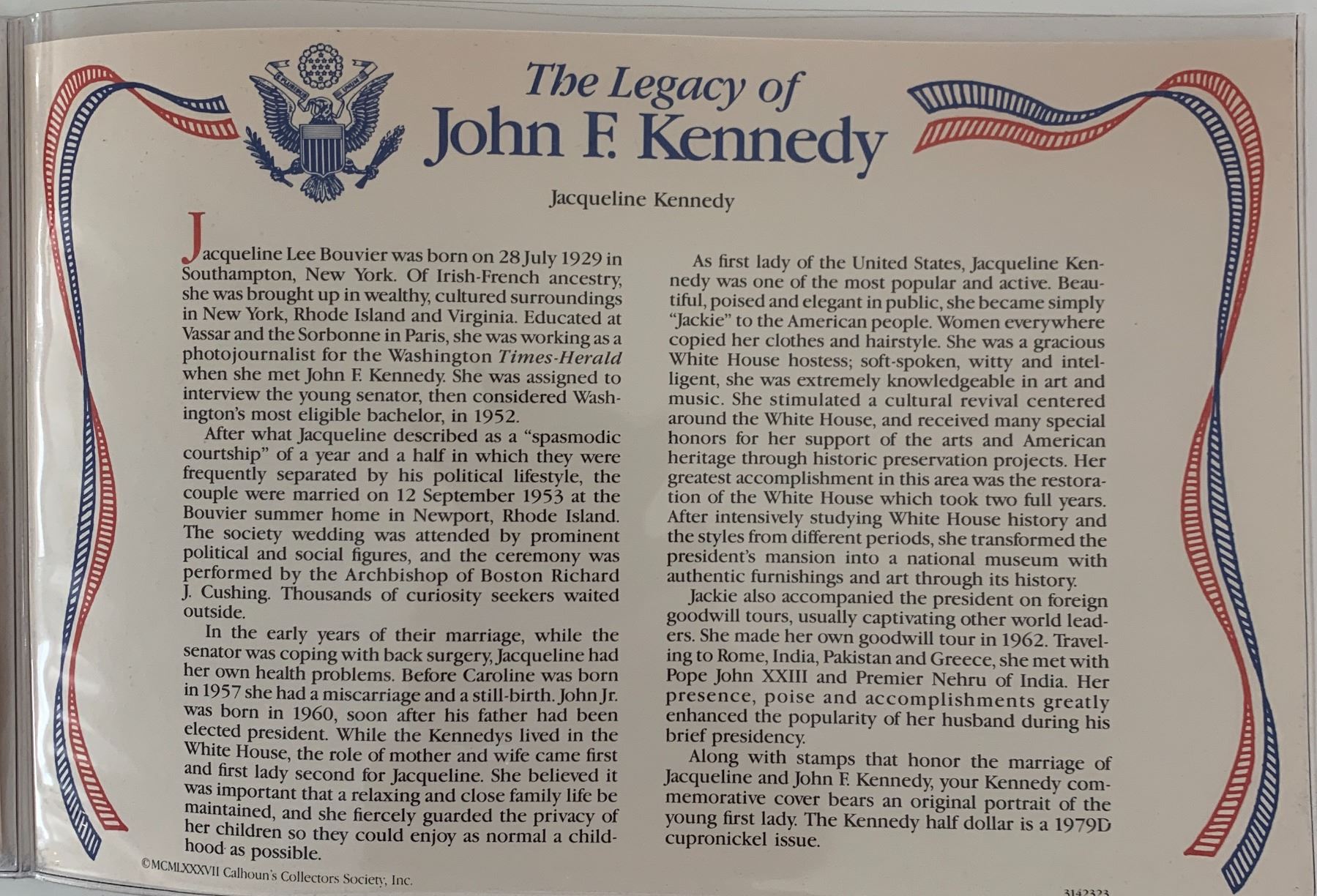 John F. Kennedy commemorative cover featuring artwork, stamps, medallion and uncirculated half dollar. 6x9 inches