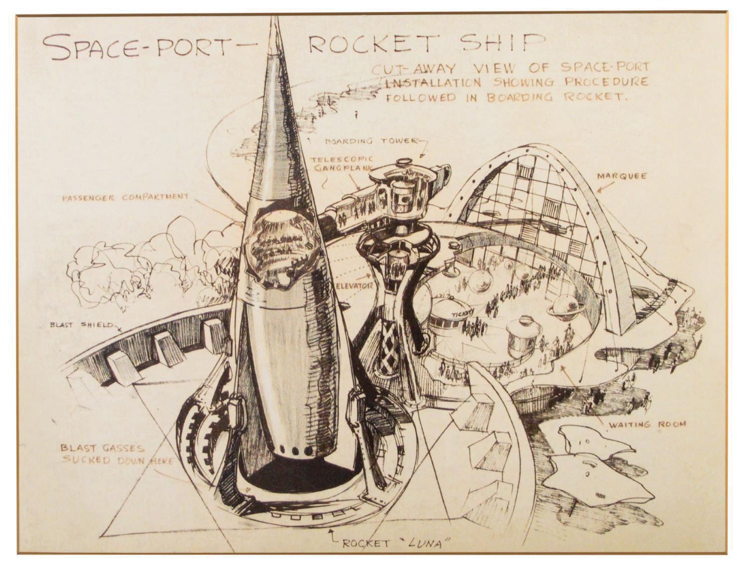 (Disneyland, 2010s) An oversized print of John Hench's design for the Space-Port Rocket Ship of Tomorrowland. Likely created for a temporary exhibit at Disneyland, the print is adhered to a 26"x19.75" sheet of particle board. It is in very good condition with minor surface wear.