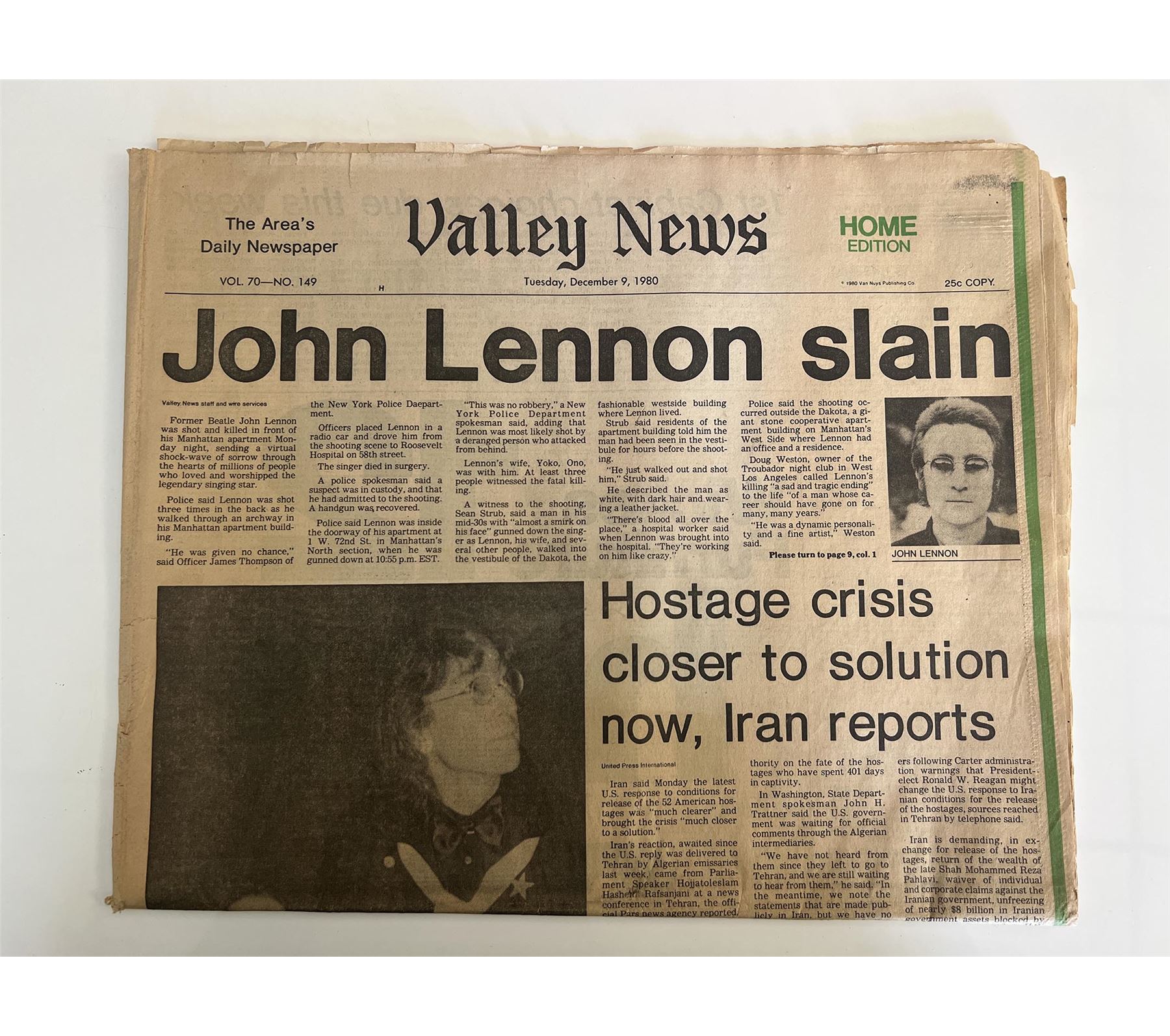 Valley News December 9, 1980 Vol. 70 No. 149 newspaper announcing John Lennon's death.13x11 inches
